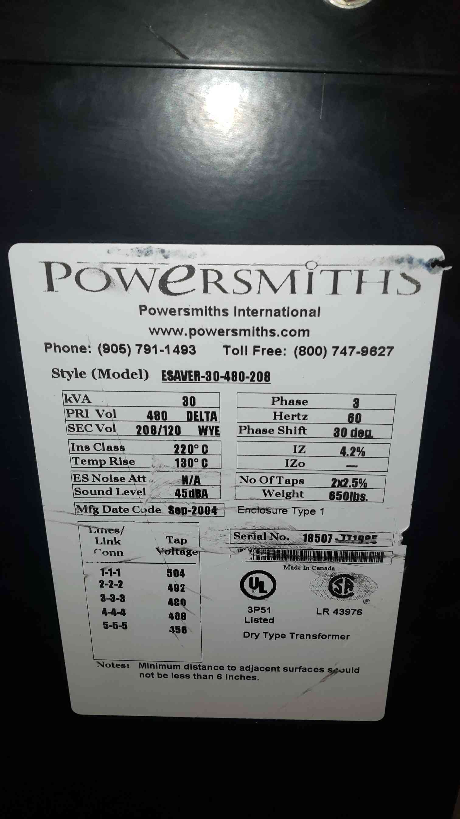 PowerSmiths 30KVA 480v x 208Y/120 3PH Dry Transformer ESAVER-30-480-208 (SKU: 106913)