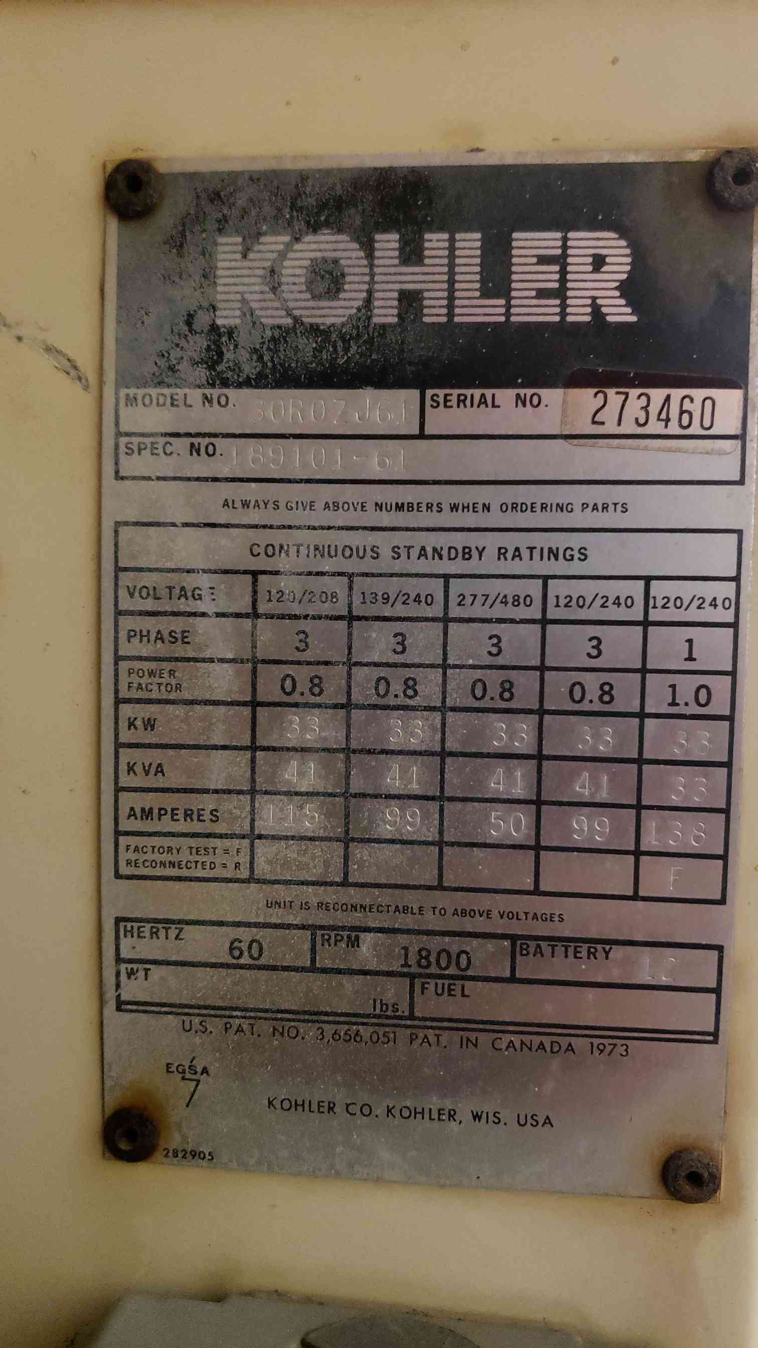 33KW KOHLER 30KW 30R0ZJ61 John Deere 4239D Diesel 292Hrs TESTED (SKU: 107124)