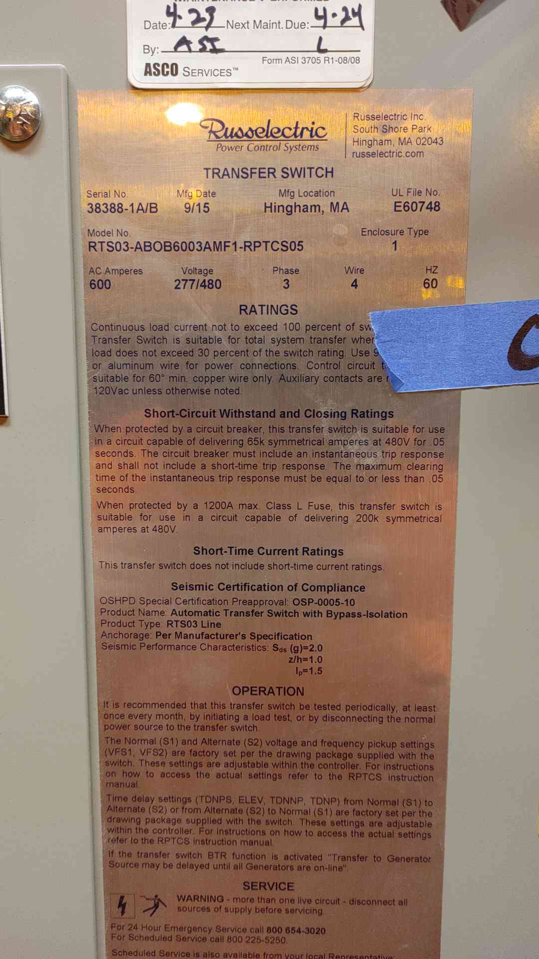 Russelectric Transfer Switch 600A 277/480VAC 3PH 4W RTS03-AB0B6003AMF1-RPTCS05