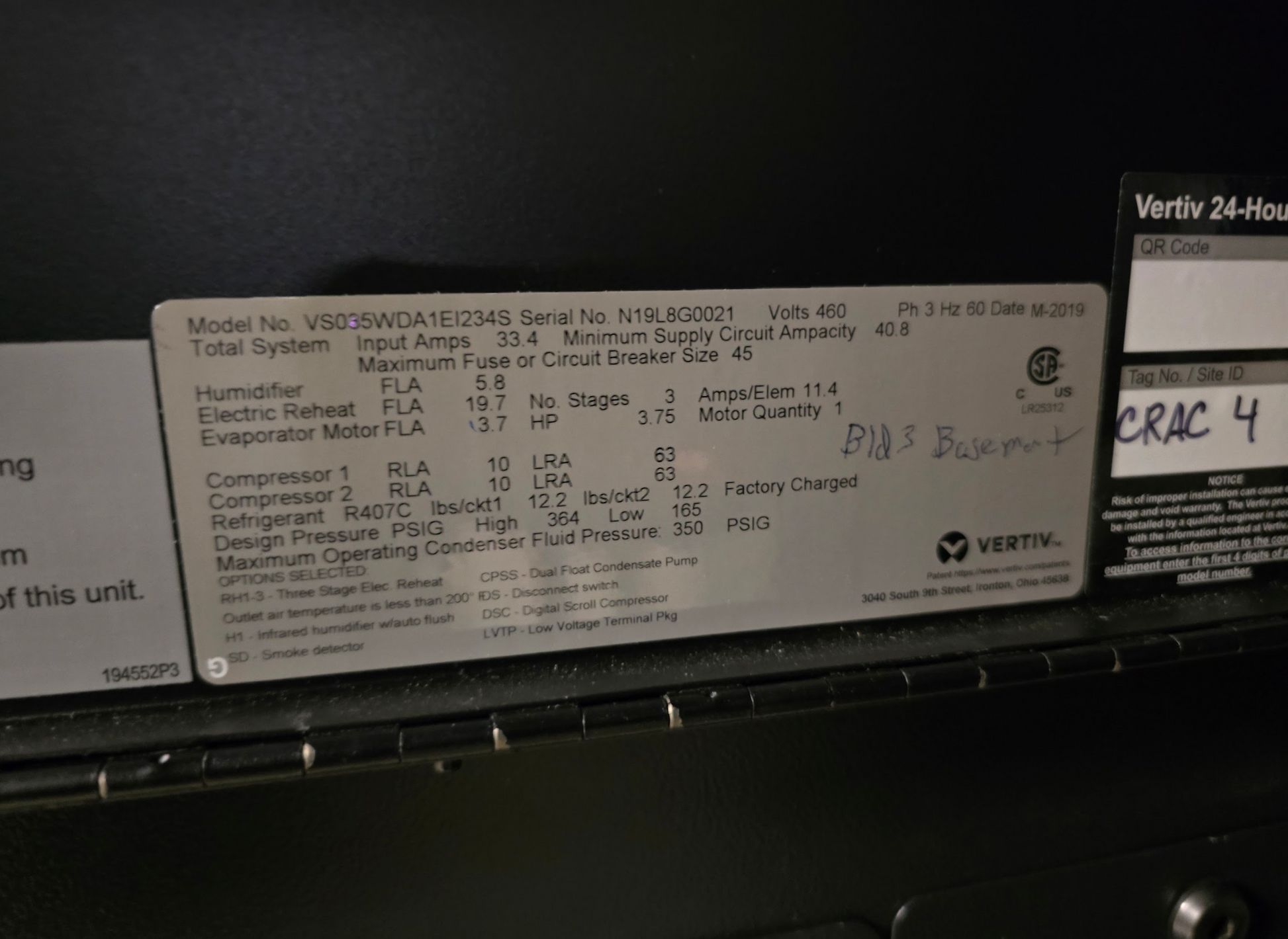 Liebert Vertiv 10 Ton VS035W Upflow AC 460v 3PH CRAC UNIT