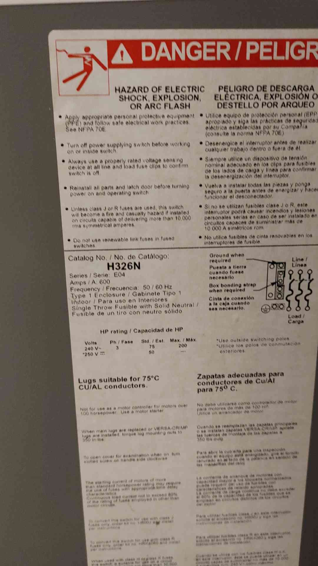 Square D Heavy Duty Safety Switch 600A 240VAC 250VDC H326N