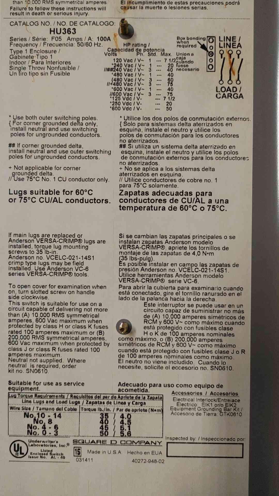 Square D Heavy Duty Safety Switch 100A 600v HU363 (108881)