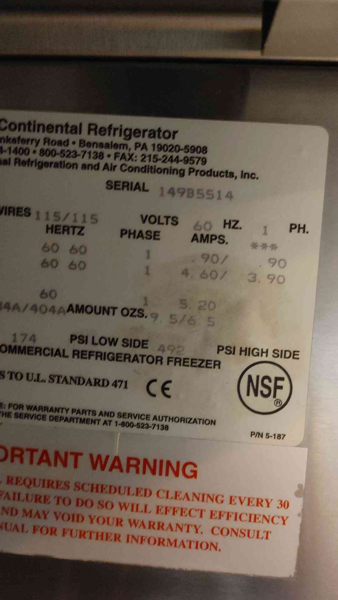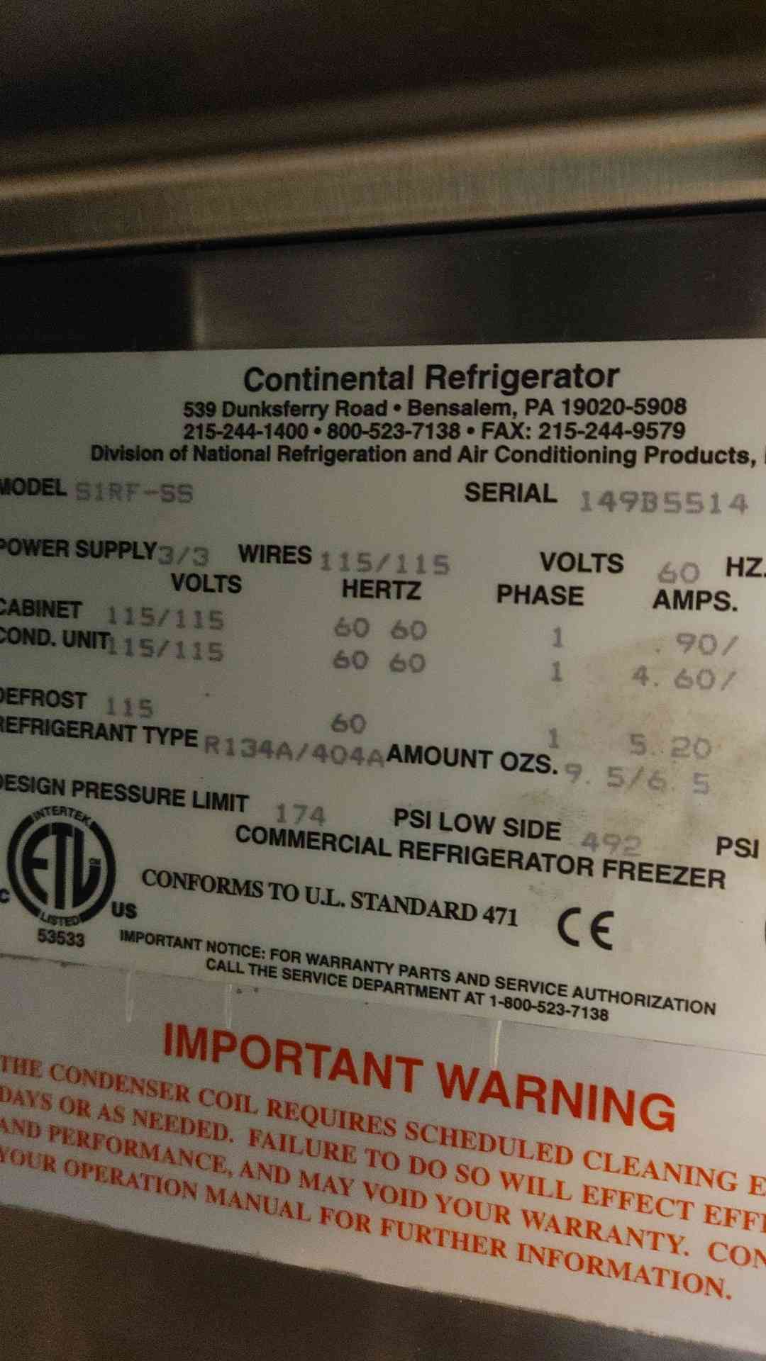 Continental Refrigerator S1RF-SS 115 V 60/90 Amp R134A/404A 2 Door (109175)