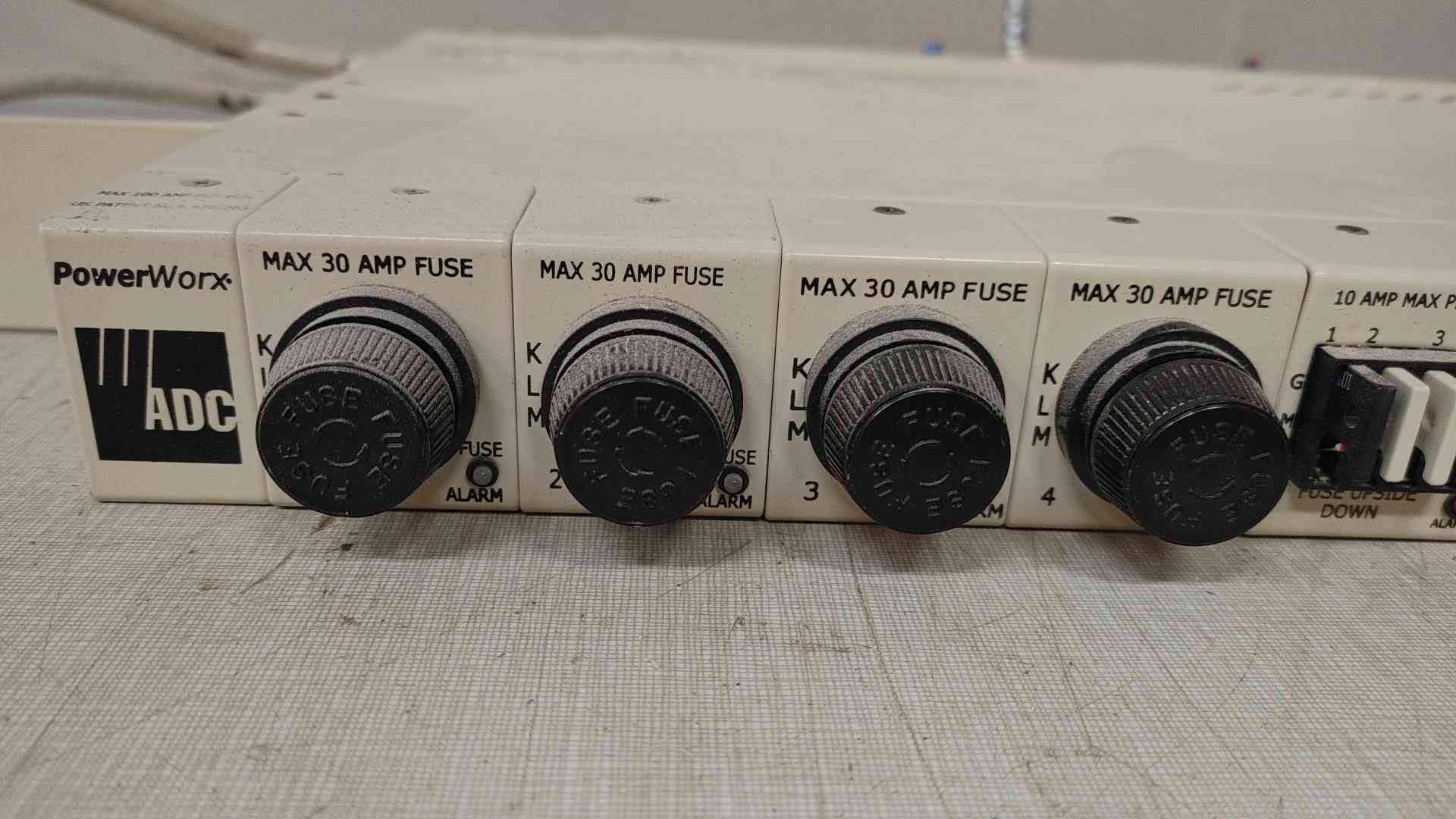 Features: It has multiple fuse positions (some labeled "MAX 30 AMP FUSE," others "10 AMP MAX PER FUSE"), with individual alarm indicators for each fuse. There are "POWER" indicators and switches for "TRANSFER SOURCE UP" and "TRANSFER SOURCE DOWN." The "ADC PowerWorx" branding is visible on the front, suggesting it's part of ADC's PowerWorx line, which is known for power solutions in communication networks.