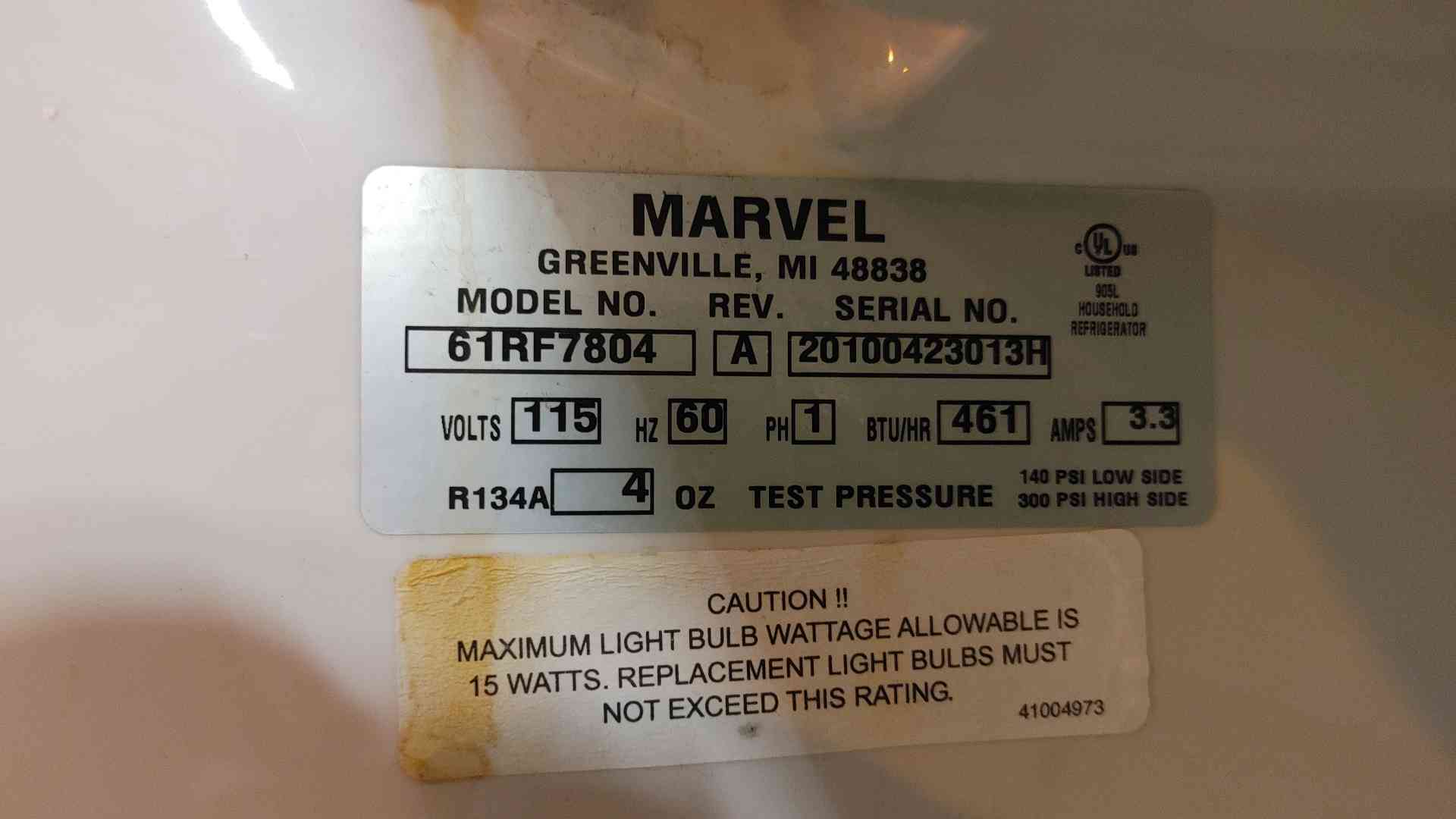 *Pickup Only* Marvel Refrigerator 61RF7804 115V 1 Ph 60 Hz 3.3 Amp (109537)