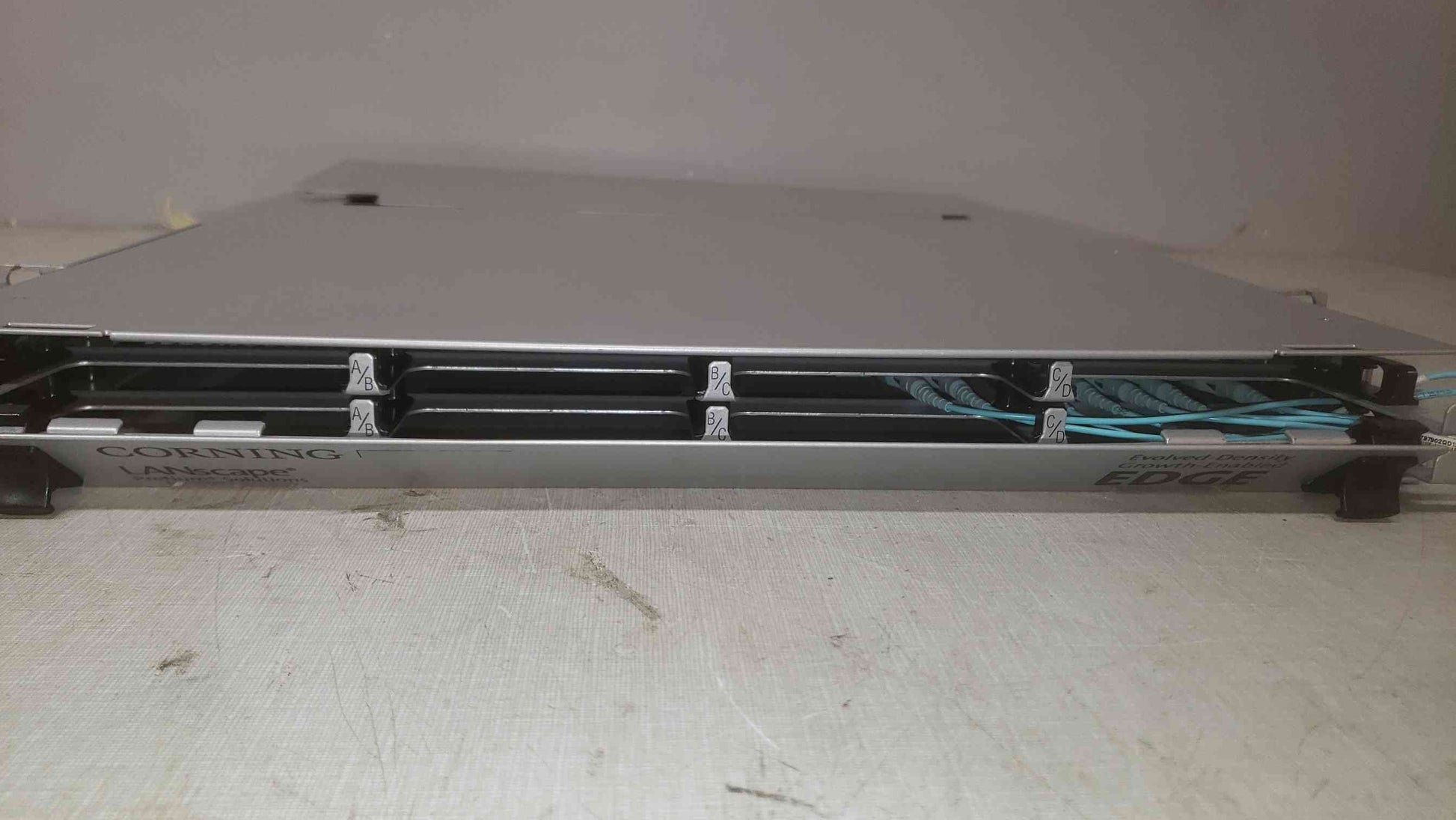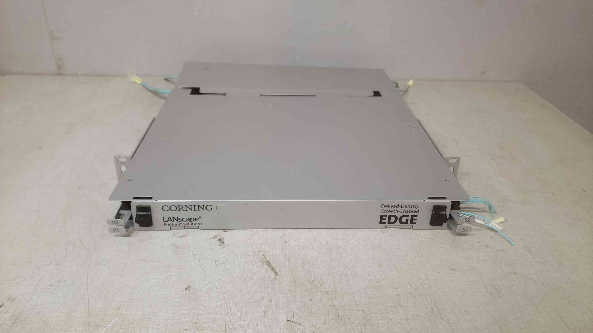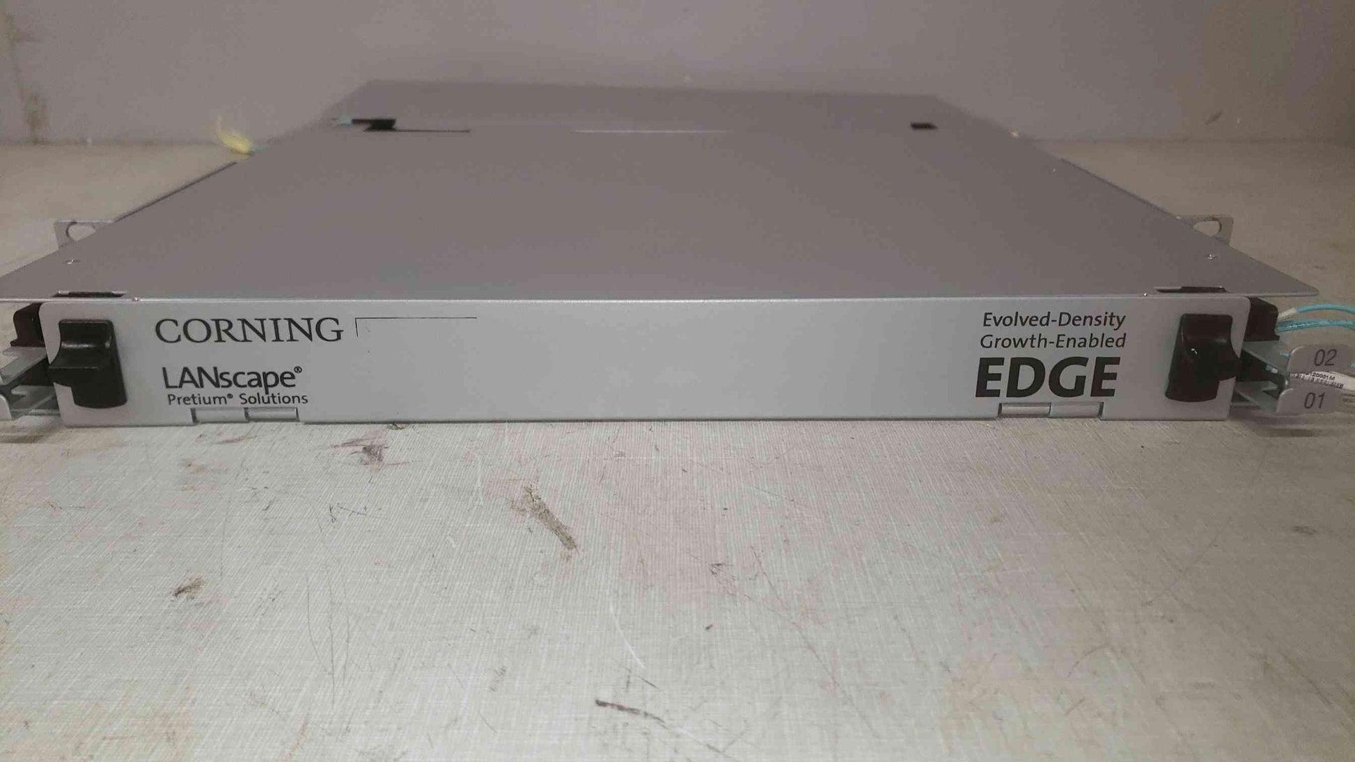 This is a 1U (1 rack unit) enclosure designed for fiber optic cable management within data centers or network environments. The "EDGE" series from Corning is known for its high-density fiber optic solutions, often used for connecting servers, storage, and networking equipment with fiber optic cables. The "Pretium" indicates it's part of Corning's high-performance fiber optic connector and cable solutions.