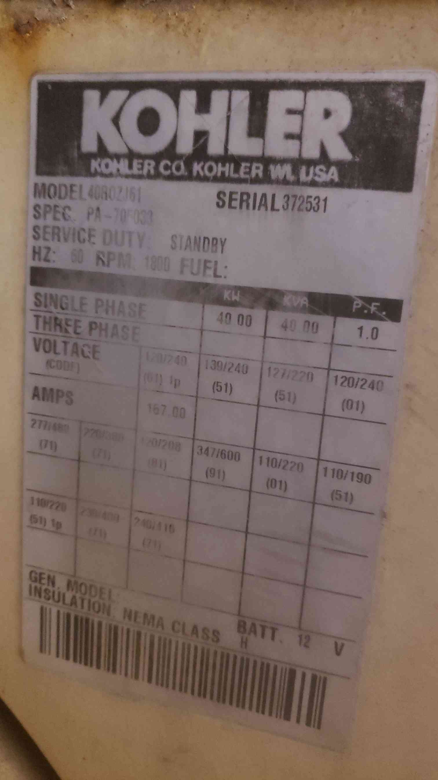 40KW Kohler 40R0ZJ61 1&3PH Diesel 1179Hrs. (SKU: 109705)