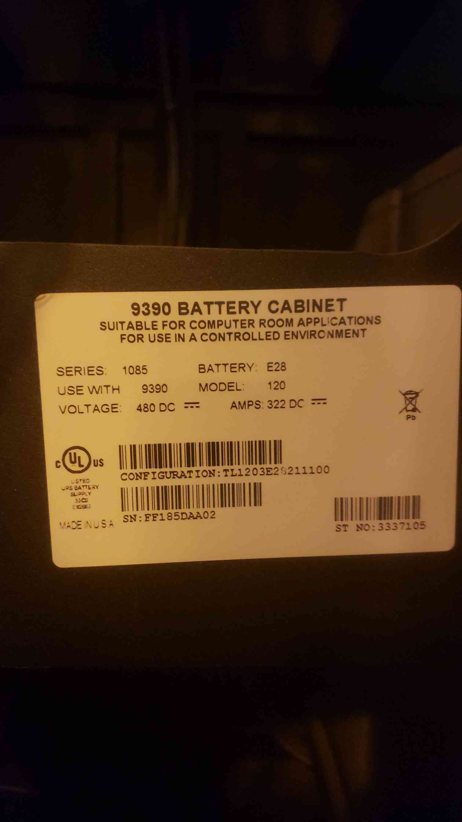 Eaton 9390 1085 Battery Cabinet 480VDC 322ADC Model 120 (SKU: 109731)