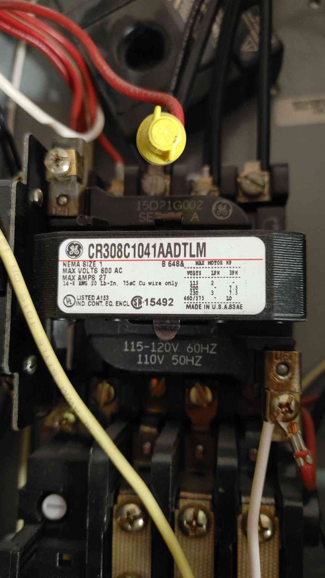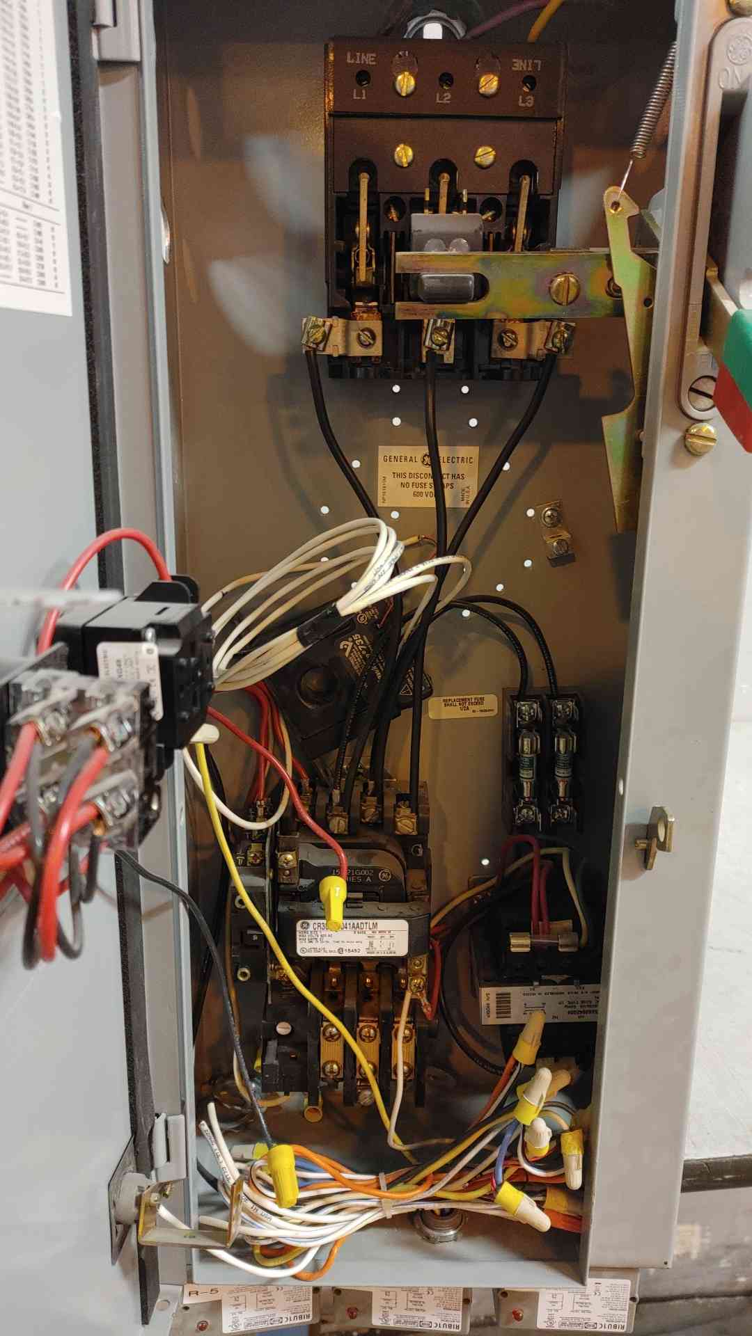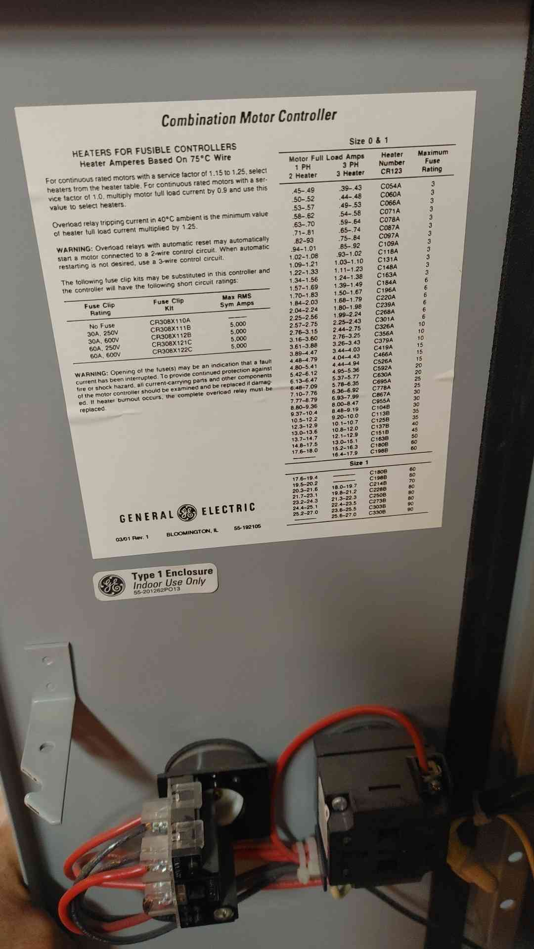 General Electric NEMA Size 1 combination motor starter in a Type 1 enclosure, designed to control and protect an electric motor (likely for an AHU) operating at up to 600V AC, with a 115-120V control circuit. It integrates a motor starter/contactor, overload protection, and short-circuit protection (fuses) within a single enclosure, along with manual/automatic control capabilities.