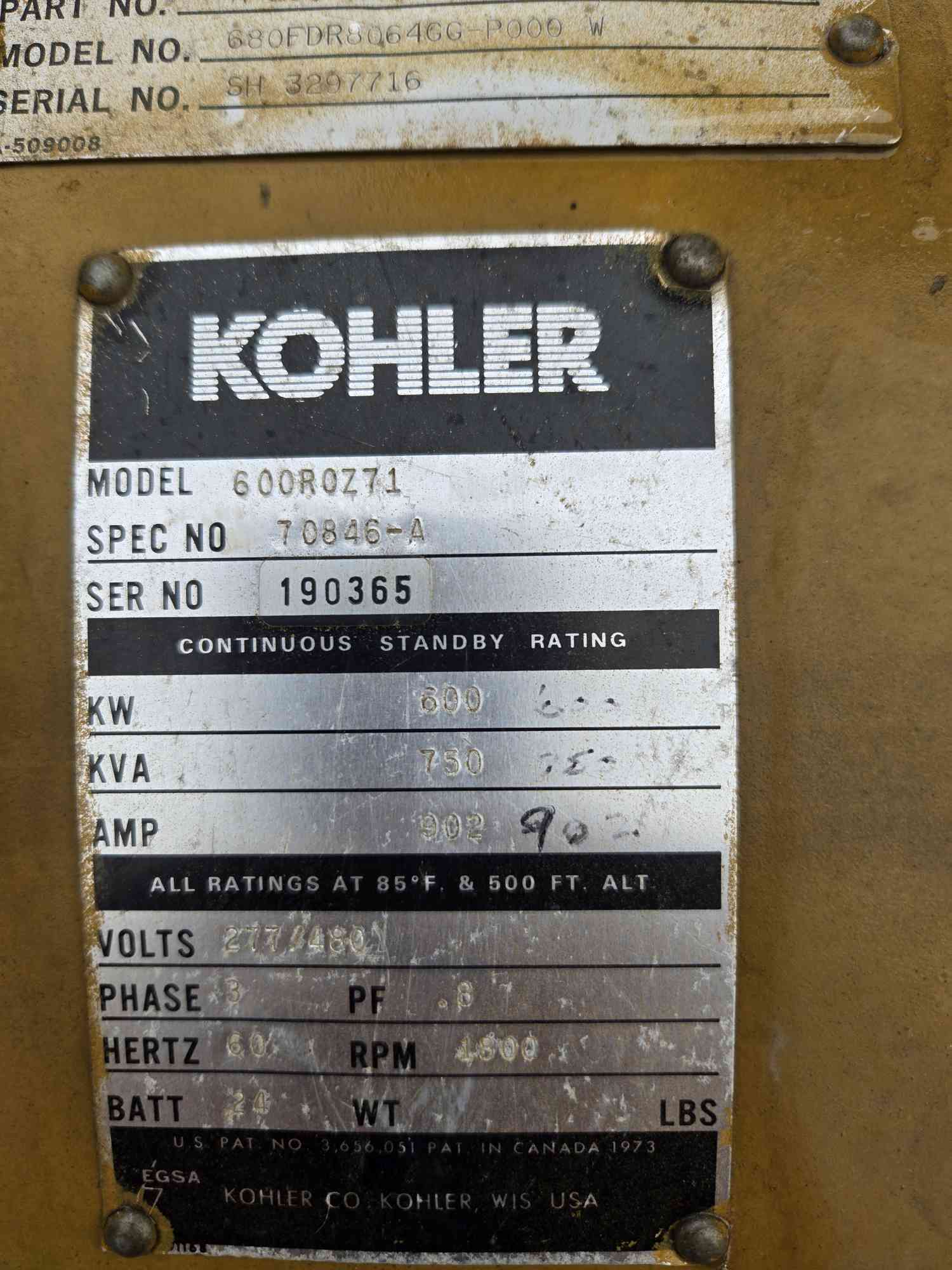 600 KW Kohler Generator 277/480V 3Ph 842 Hours