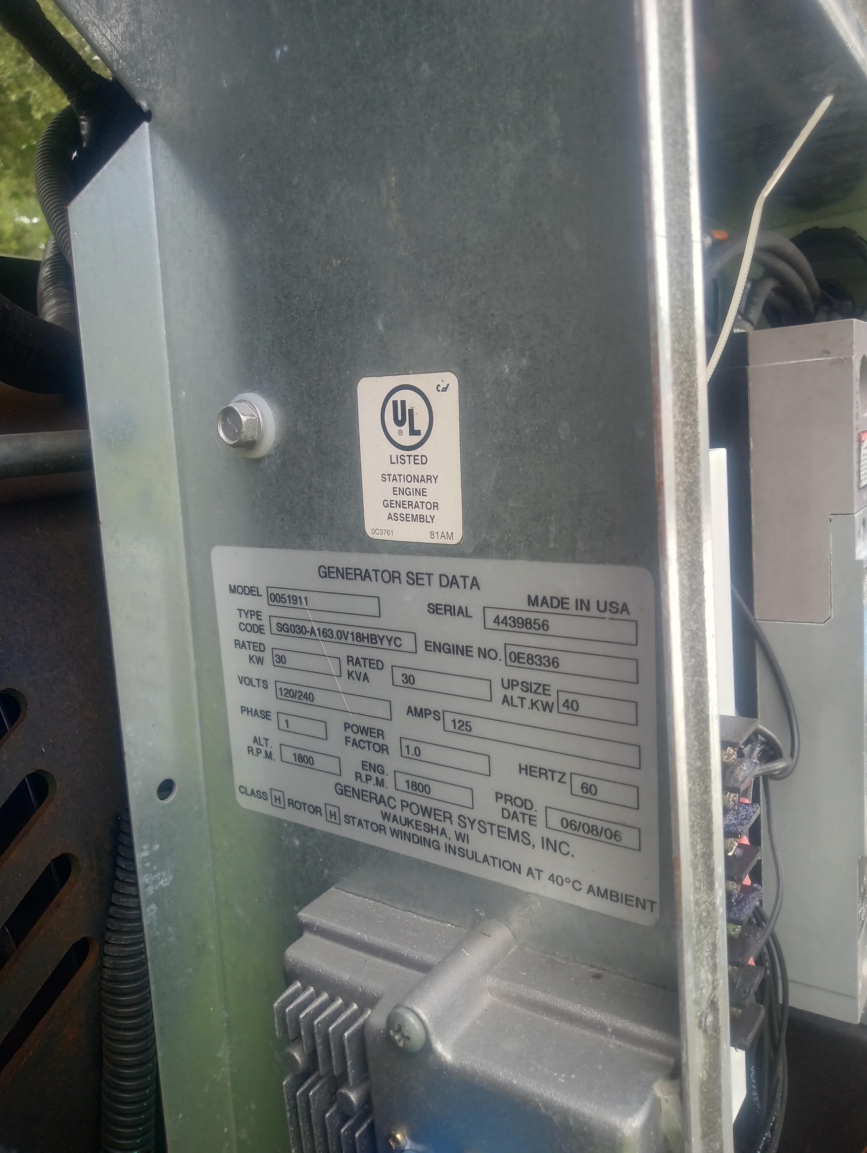 AS-IS 30KW Generac 120/240V 125A 1PH 5191-1 '06 NG/LP Generator UNTESTED SKU: 110290)