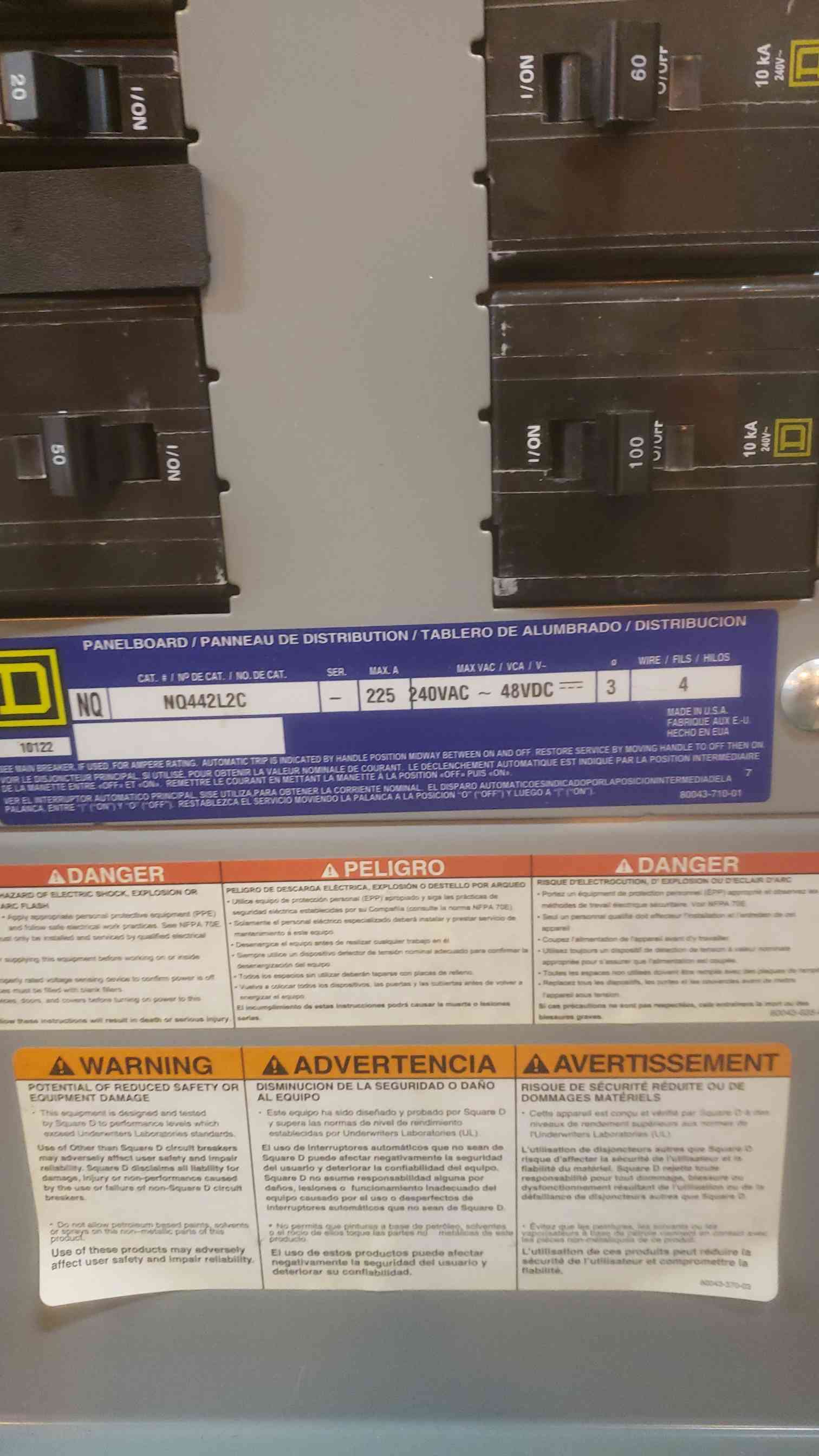 SQUARE D NQ 225A 240VAC/48VDC 3PH 4Wire Panelboard NC38SHR(SKU: 110370)