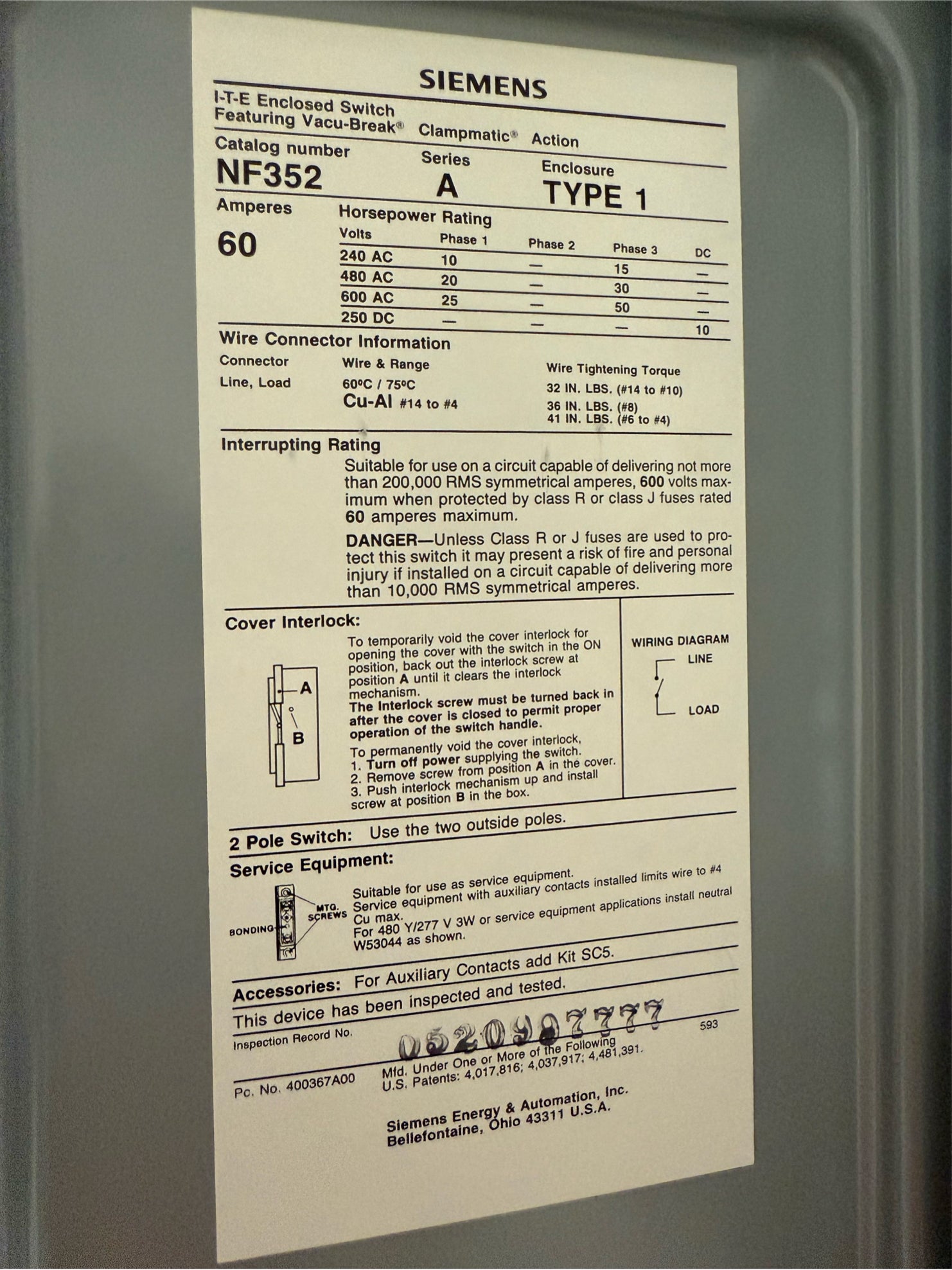 Interrupting Rating (SCCR): This is a critical safety feature. This switch can safely interrupt a very high fault current—up to 200,000 Amps—when protected by 60A Class R or Class J fuses. Without those specific high-rated fuses, its standard rating is 10,000 Amps. This high rating makes it suitable for major commercial and industrial applications.