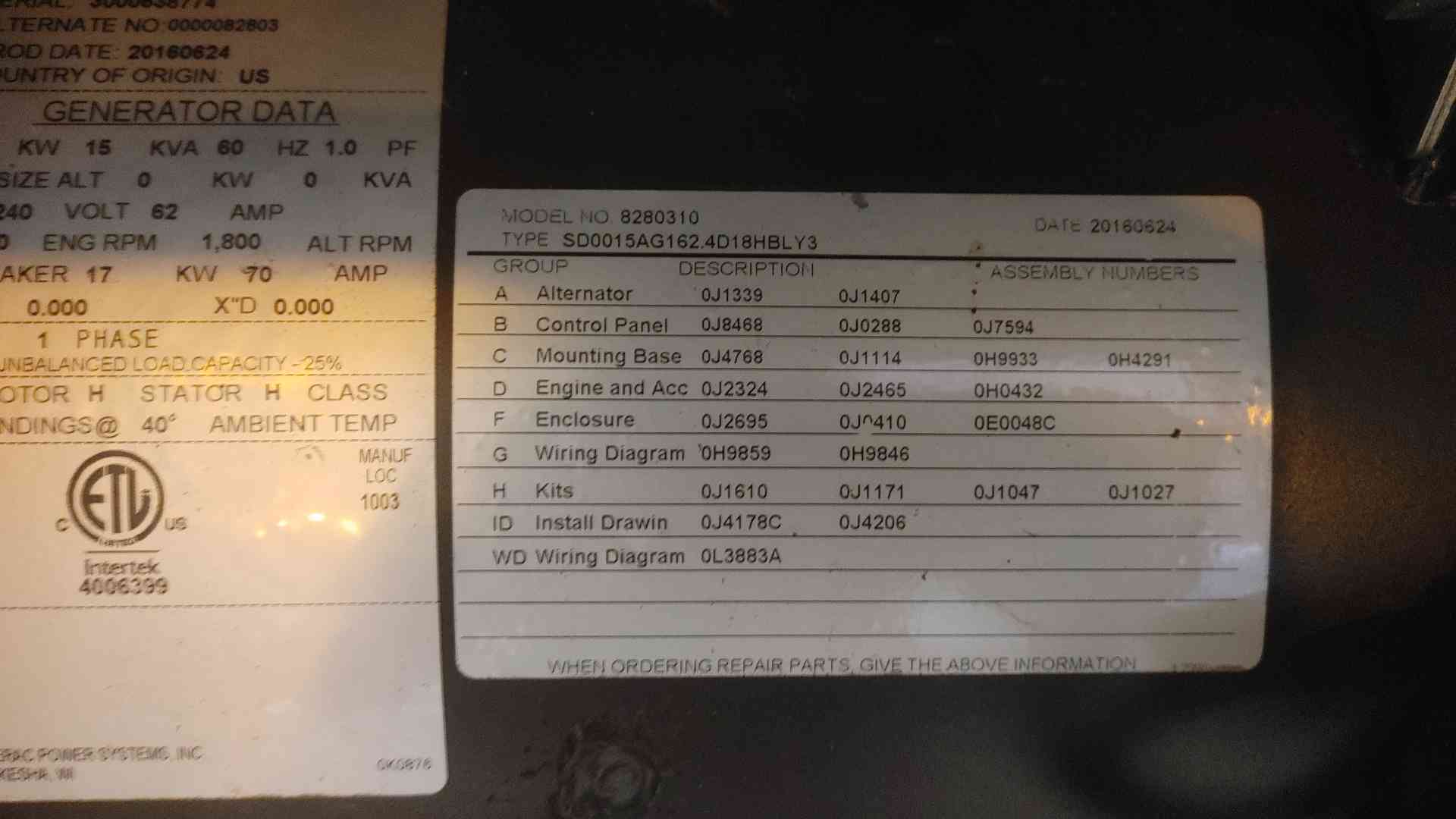15KW GENERAC 120/240V 62A 1PH 60Hz Diesel Generator SD15 45247