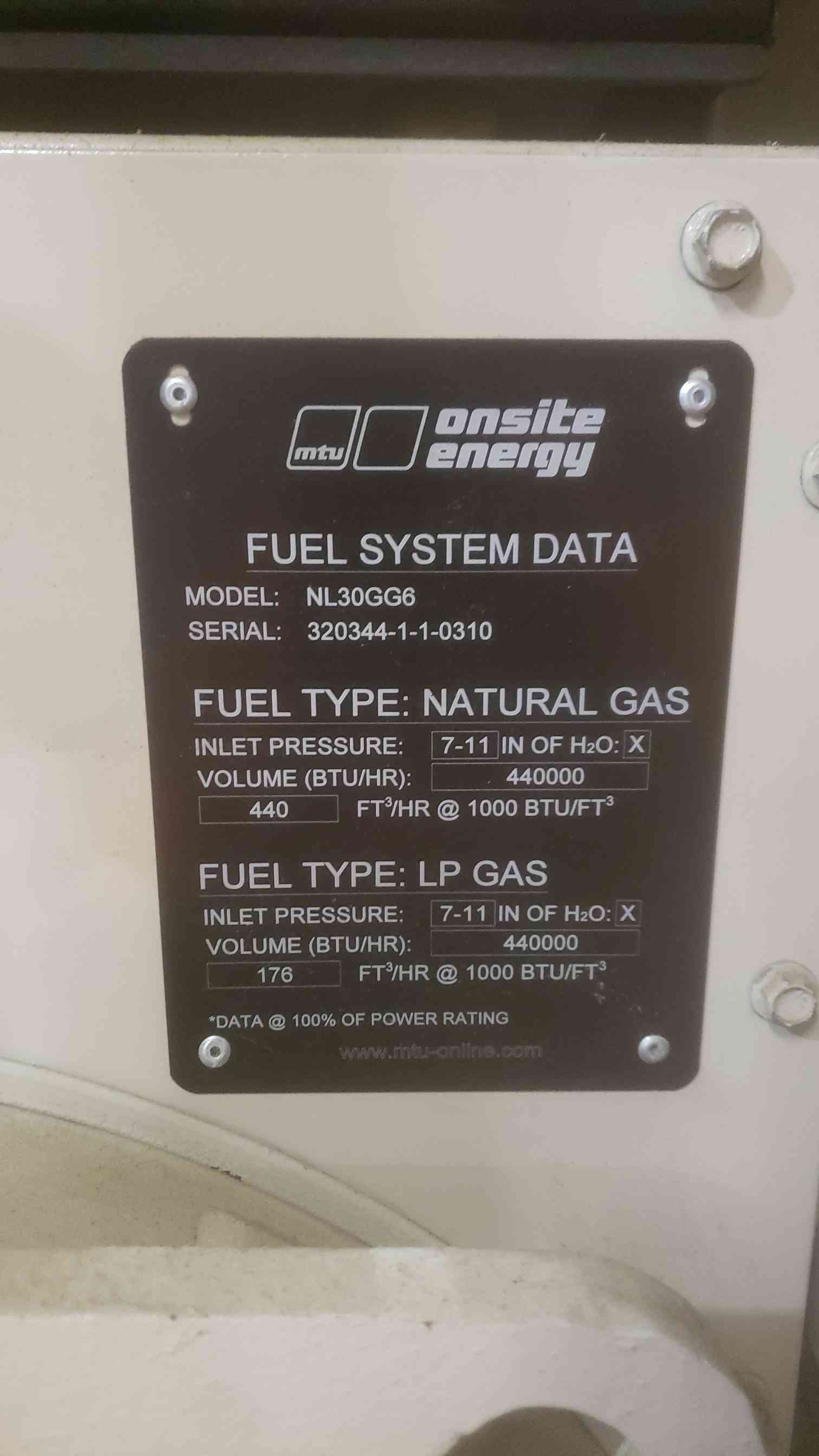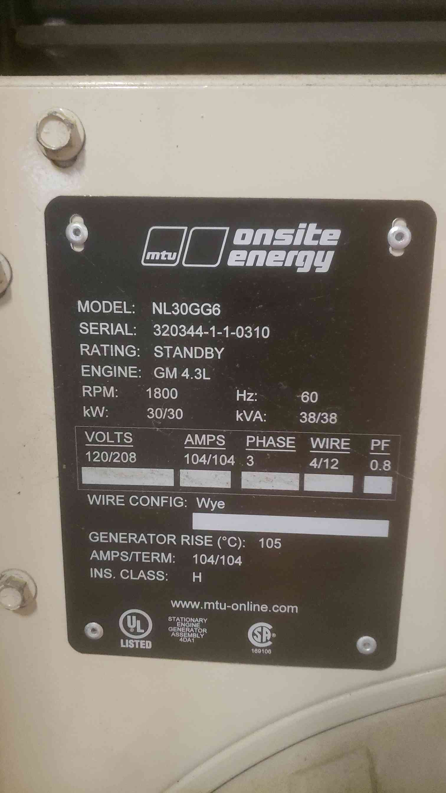 30KW MTU 120/208V 104A 3PH Nat Gas LP Generator NL30GG6 314Hrs(SKU: 110681)