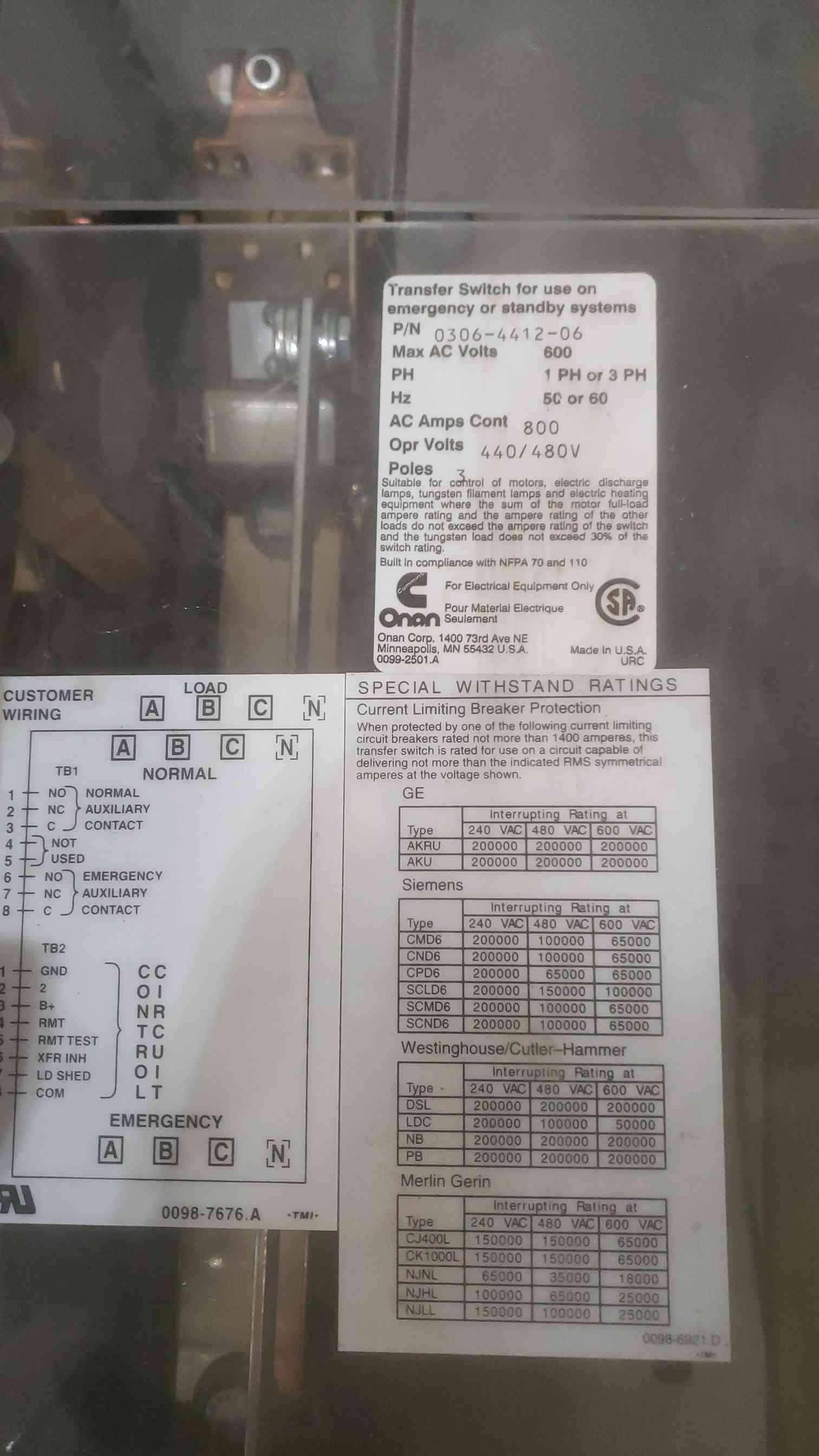 Onan 600A 480V PowerCommand ATS Transfer Switch OTPCD-4954402 '01 (SKU: 110836)