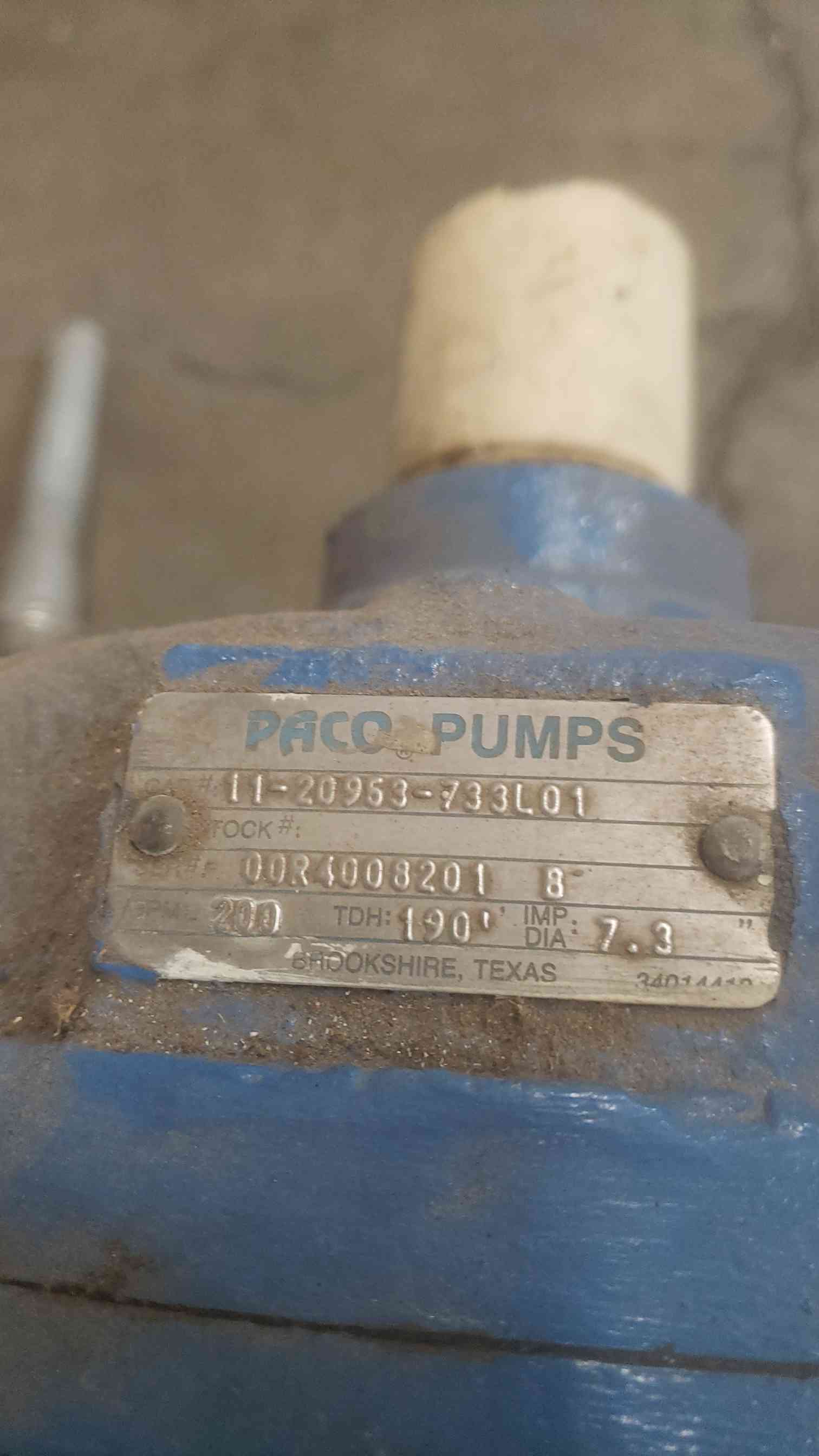 Attached to the motor is a Paco Centrifugal Pump. Paco pumps are well-regarded in the industry for use in HVAC systems, water treatment, and other industrial fluid handling.