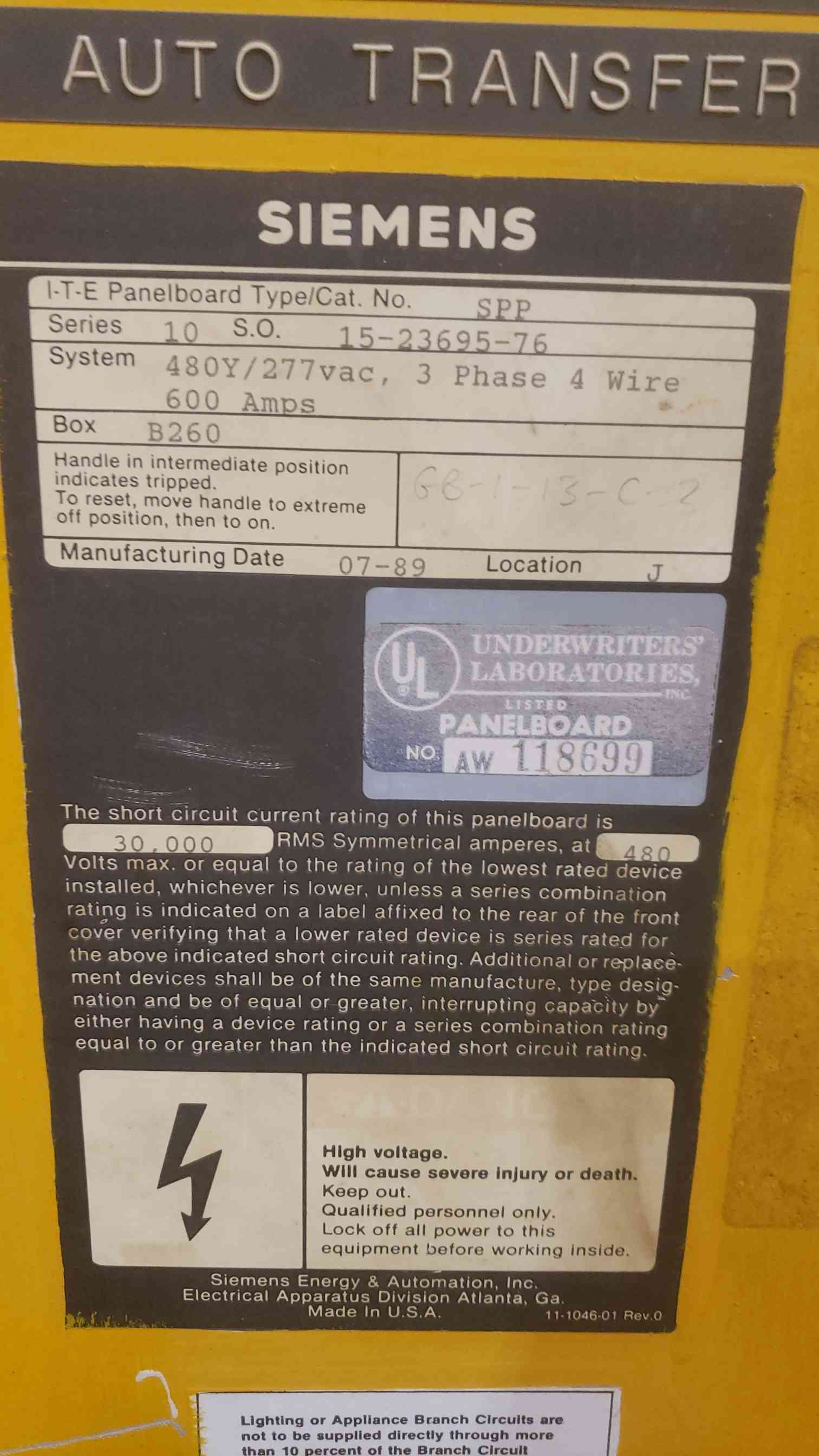 Siemens 600A 480Y/277 3PH 4W 14 Breaker Panelboard (SKU: 110977)