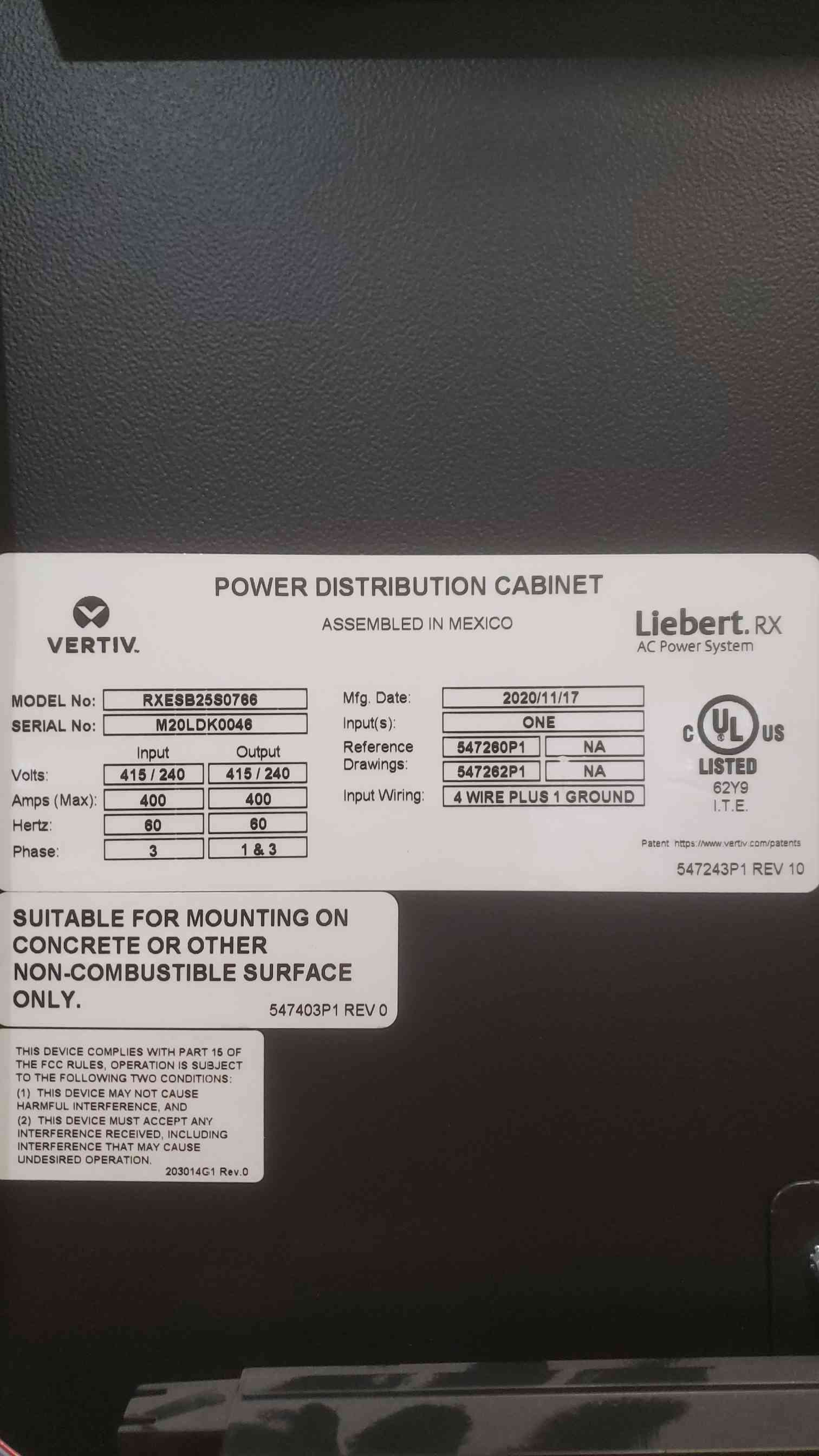 Vertiv 415/240 400A 1&3PH RPP PDU New Surplus RXESB25S0766 '20 (SKU: 110992)