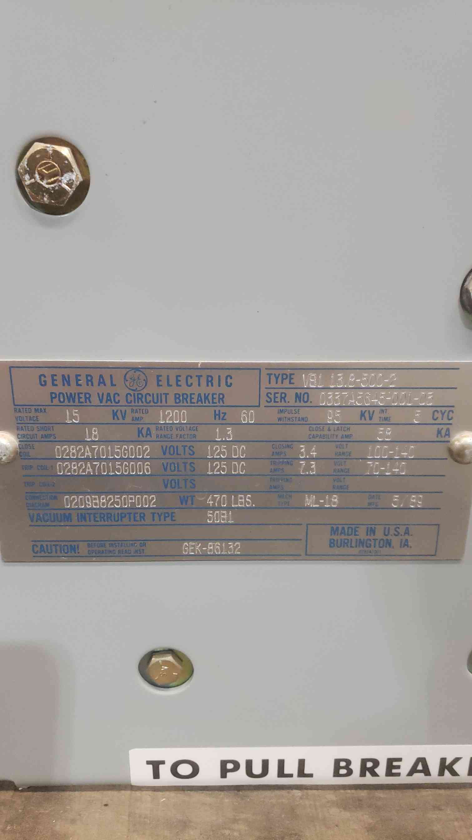 15KV GE 1200A 60Hz Power Vac VB1 Circuit Breaker VB1 13.8-500-2 (SKU: 111014)