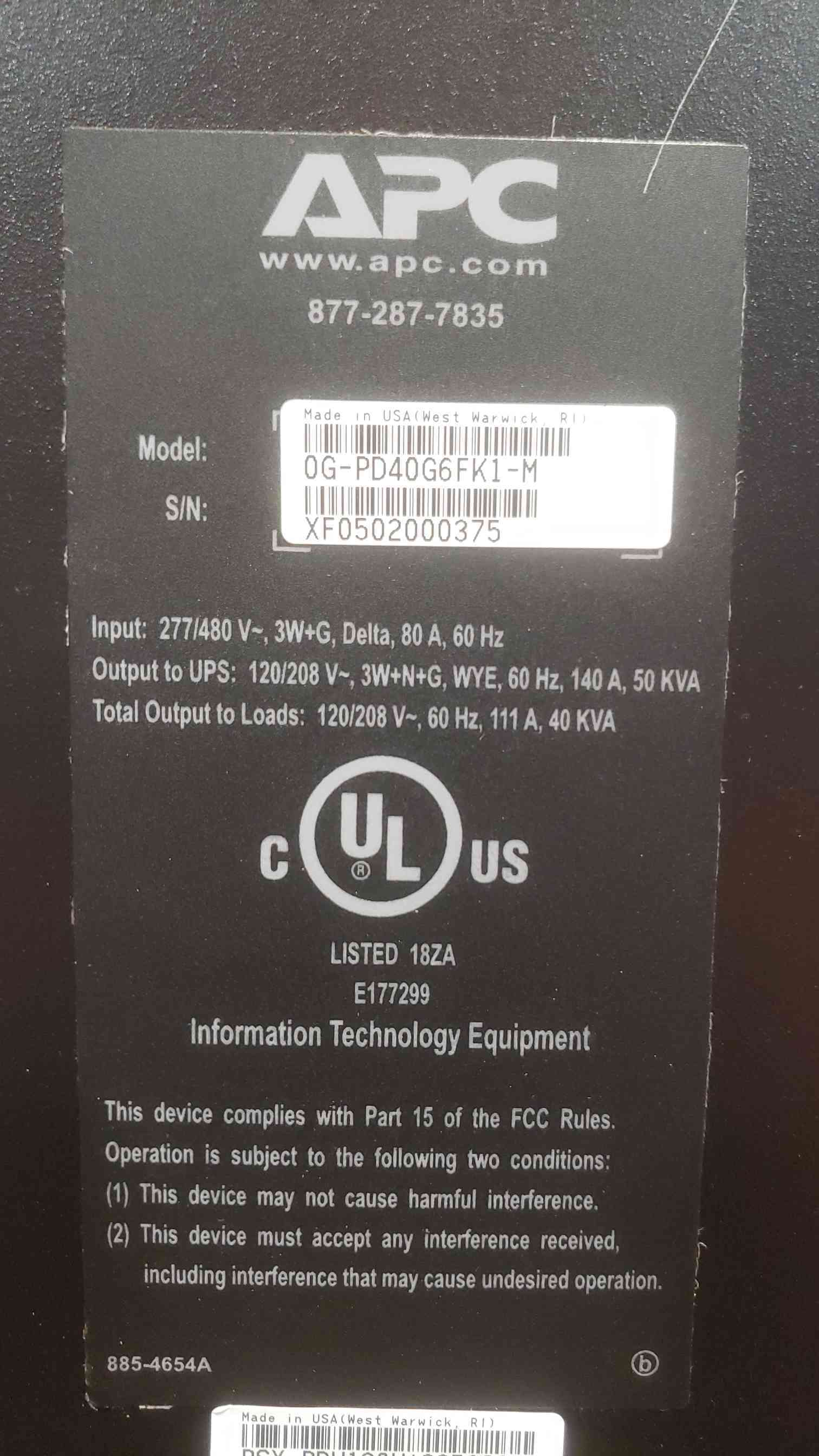 APC InfraStruxure Power Distribution Unit (PDU) 277/480V 3W+G 80A 60Hz PD40G6FK1-M