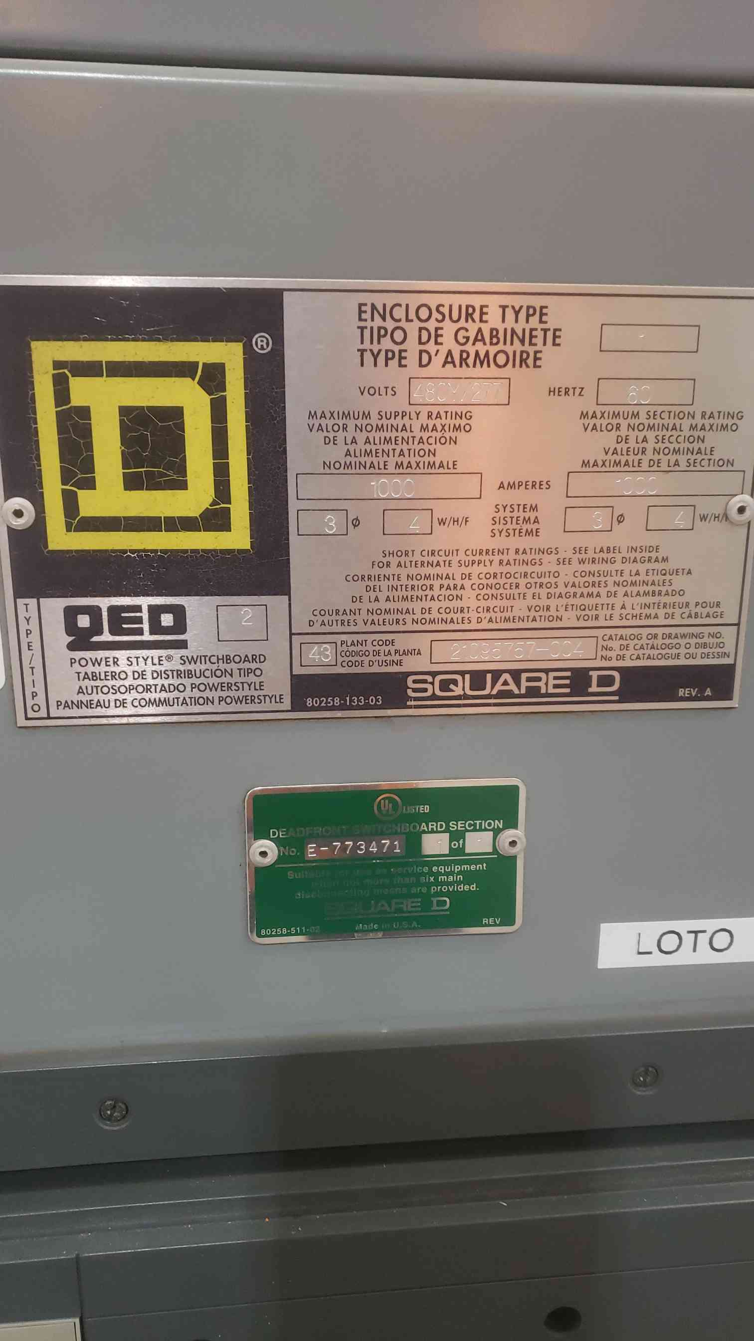 1000A QED SQUARE D Power Style Disconnect Switch 480/277V 3PH 4W 21095757-004(SKU: 111101)