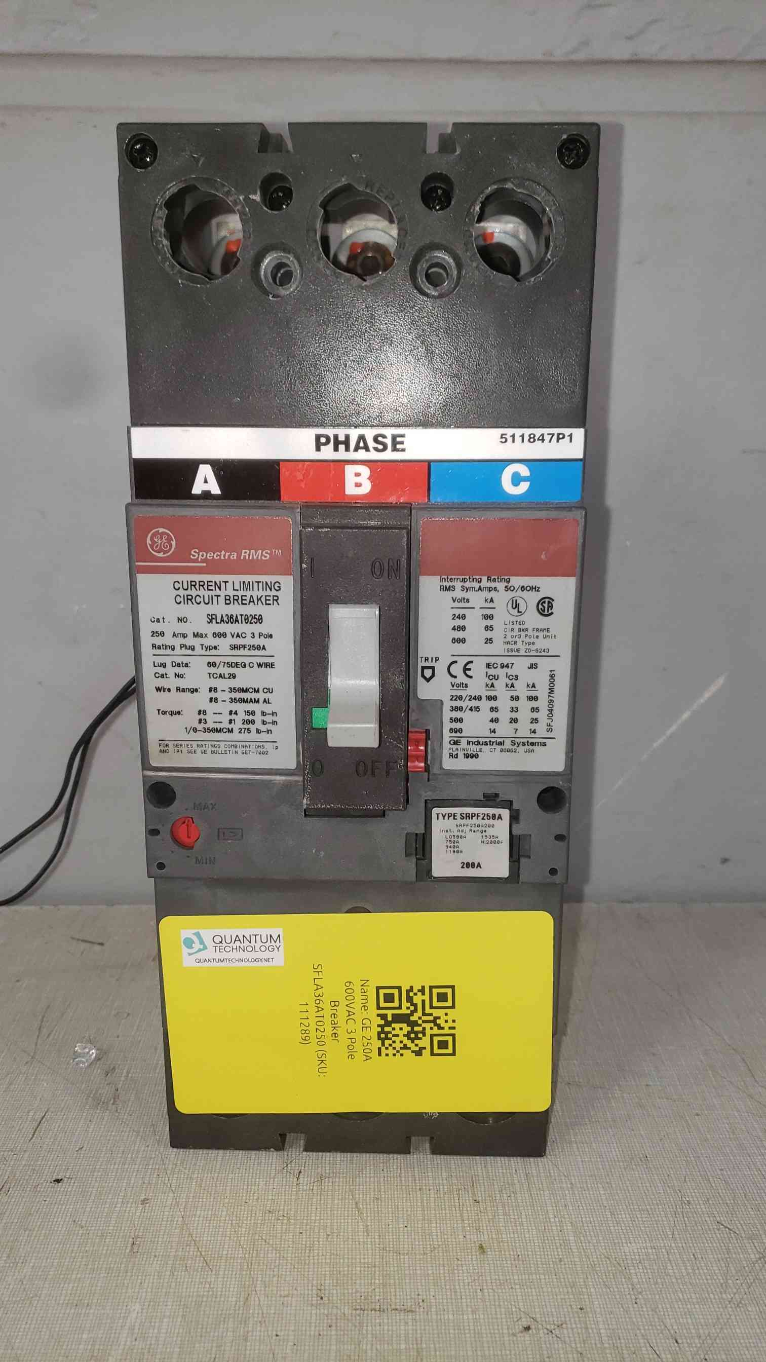 GE 250A 600VAC 3 Pole Breaker SFLA36AT0250 200A Trip