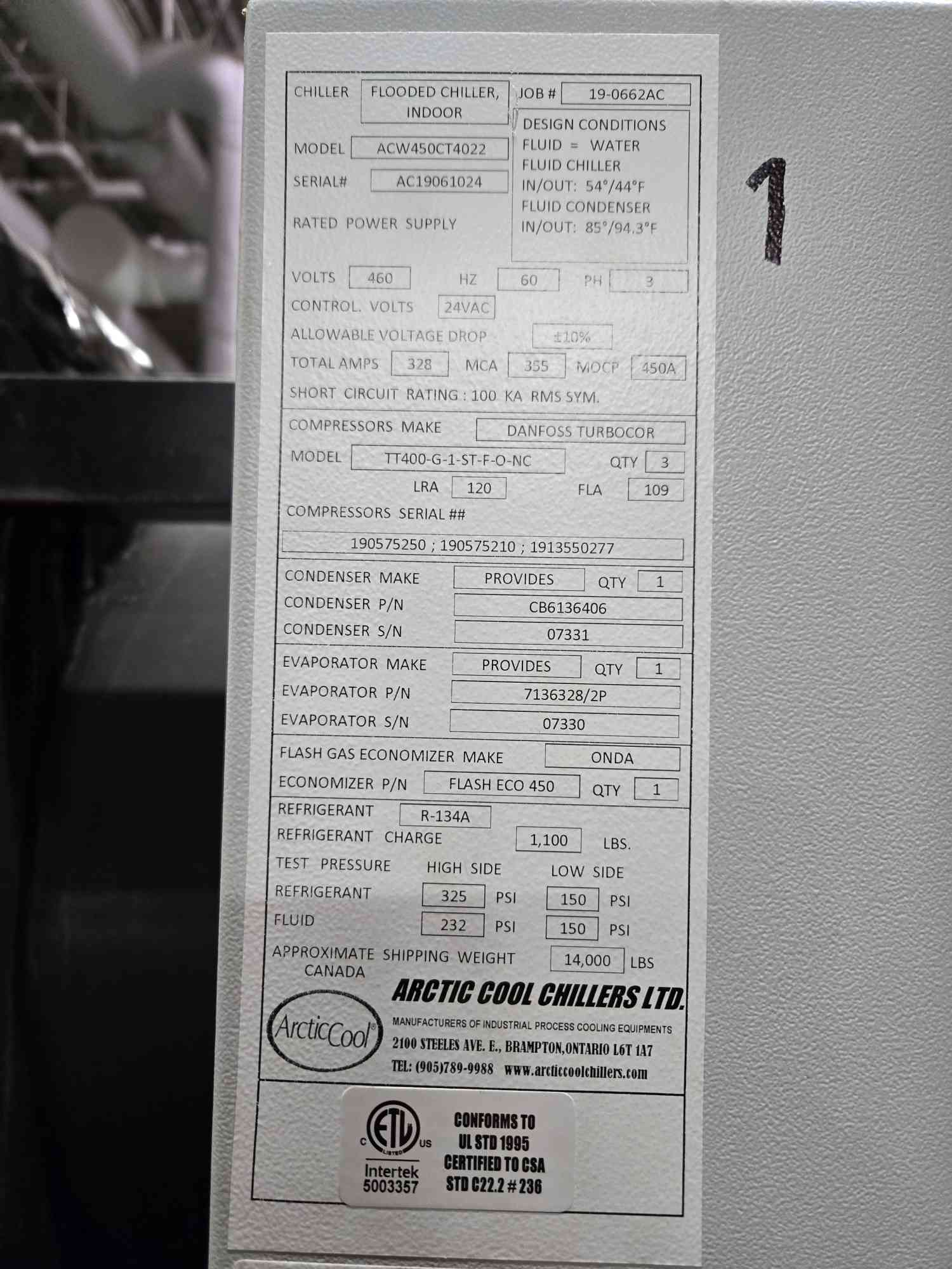 450 Ton Arctic Cool ACW450CT4022 Water Cooled Chiller 460V 3PH