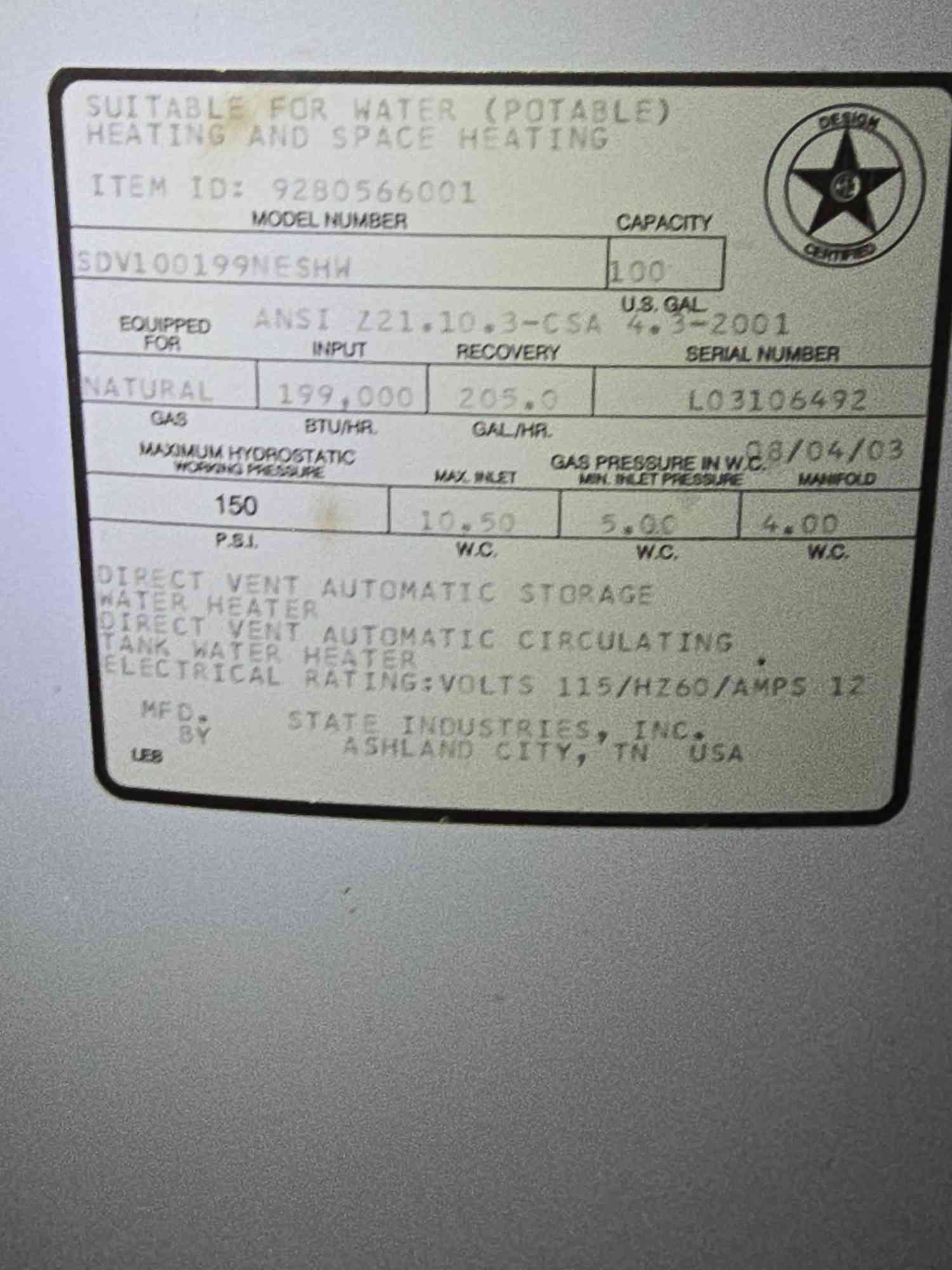 100 Gal State Sandblaster Force Commercial Water Heater SDV100199NESHW Nat Gas