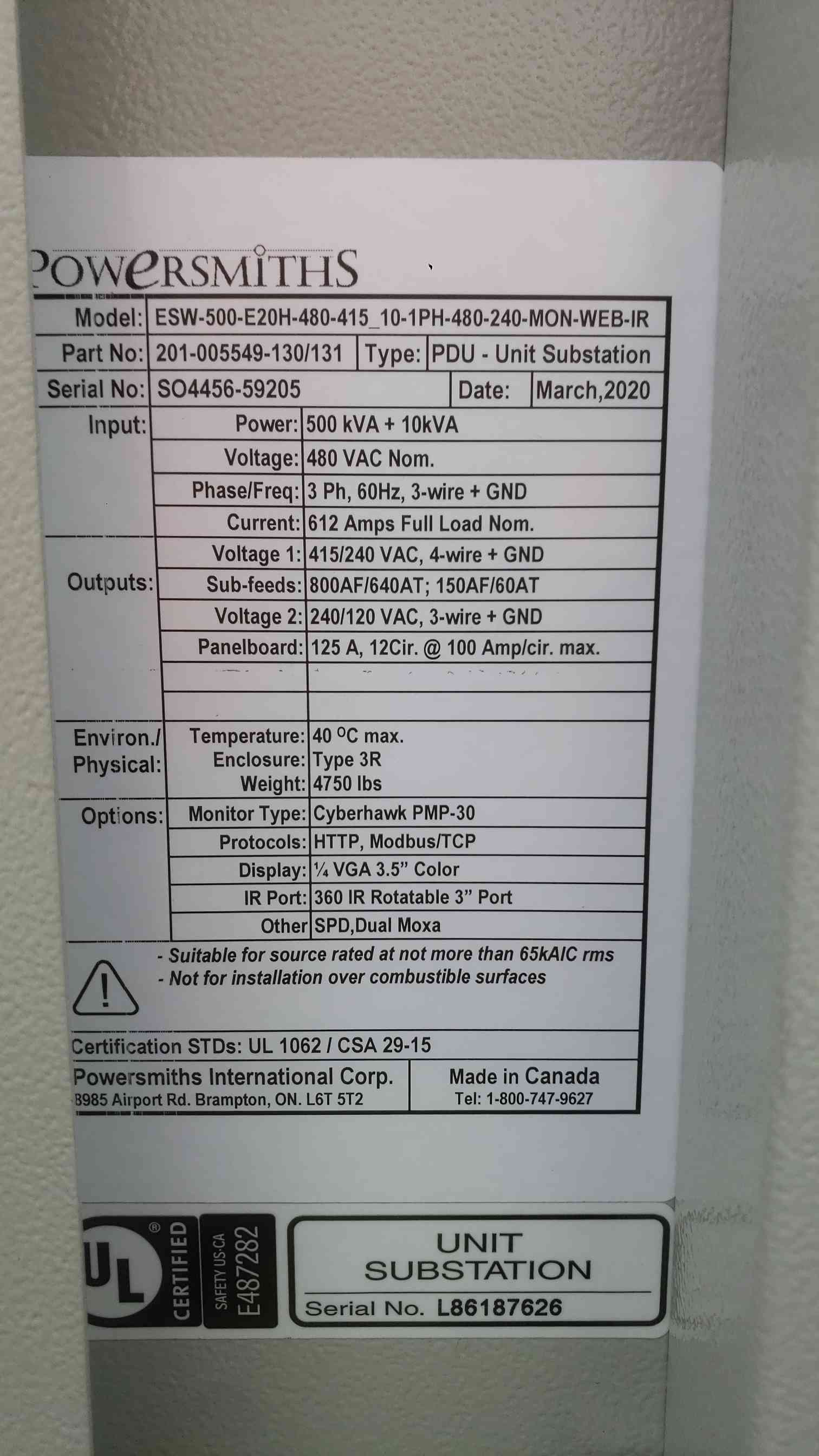 Powersmiths 500KVA 480v x 240/120v Crypto Outdoor Substation Transformer ESW-500-E20H-480-415_10-1PH-480-240-MON-WEB-IR (SKU: 111663)