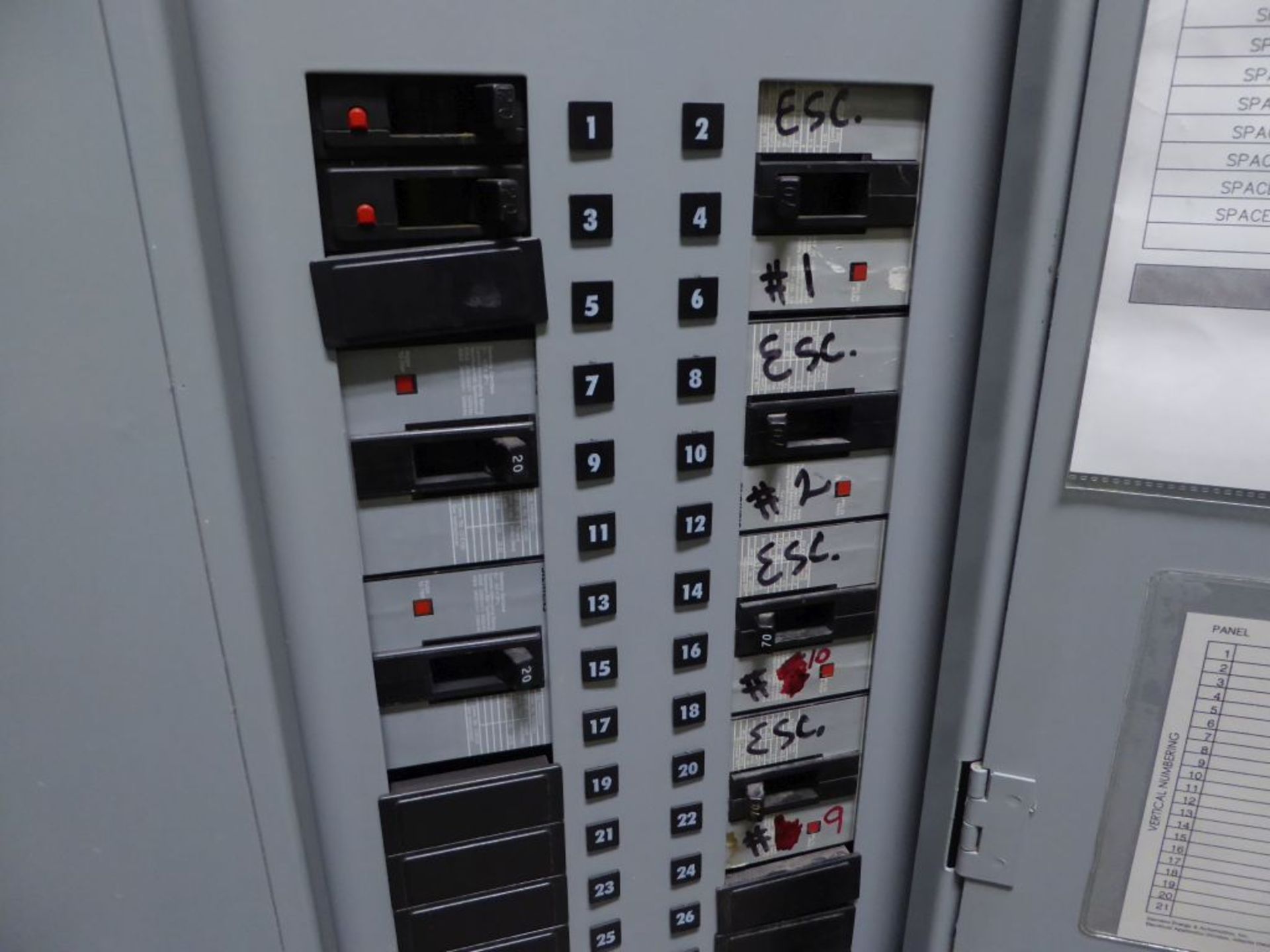 Panel Board, Cat No. SEE42ML400CTS, w/(2) 20A Circuit Breakers; (4) 70A Circuit Breakers
