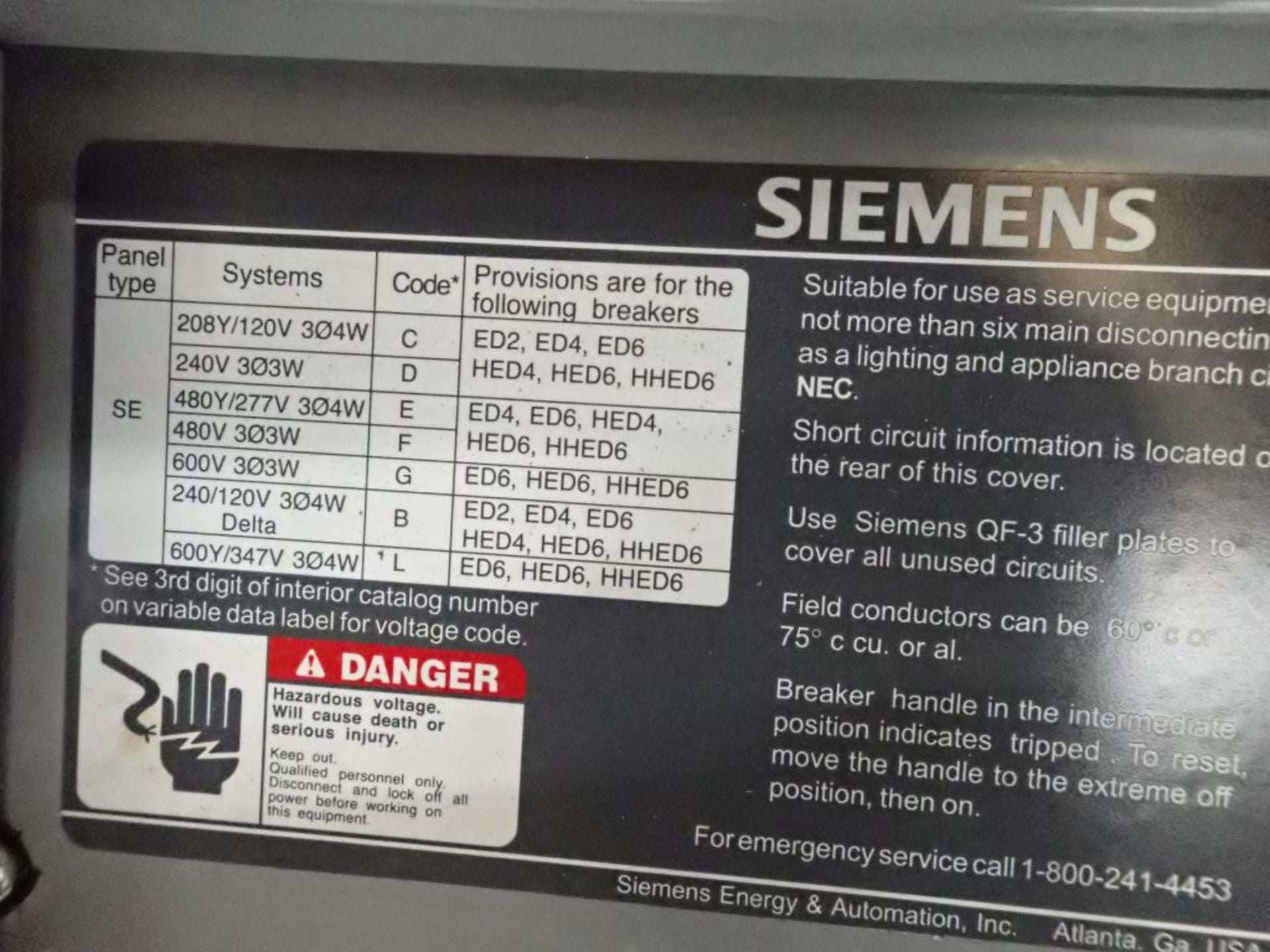 Siemens SEE42ML400CTS Panelboard 277/480v with Circuit Breakers