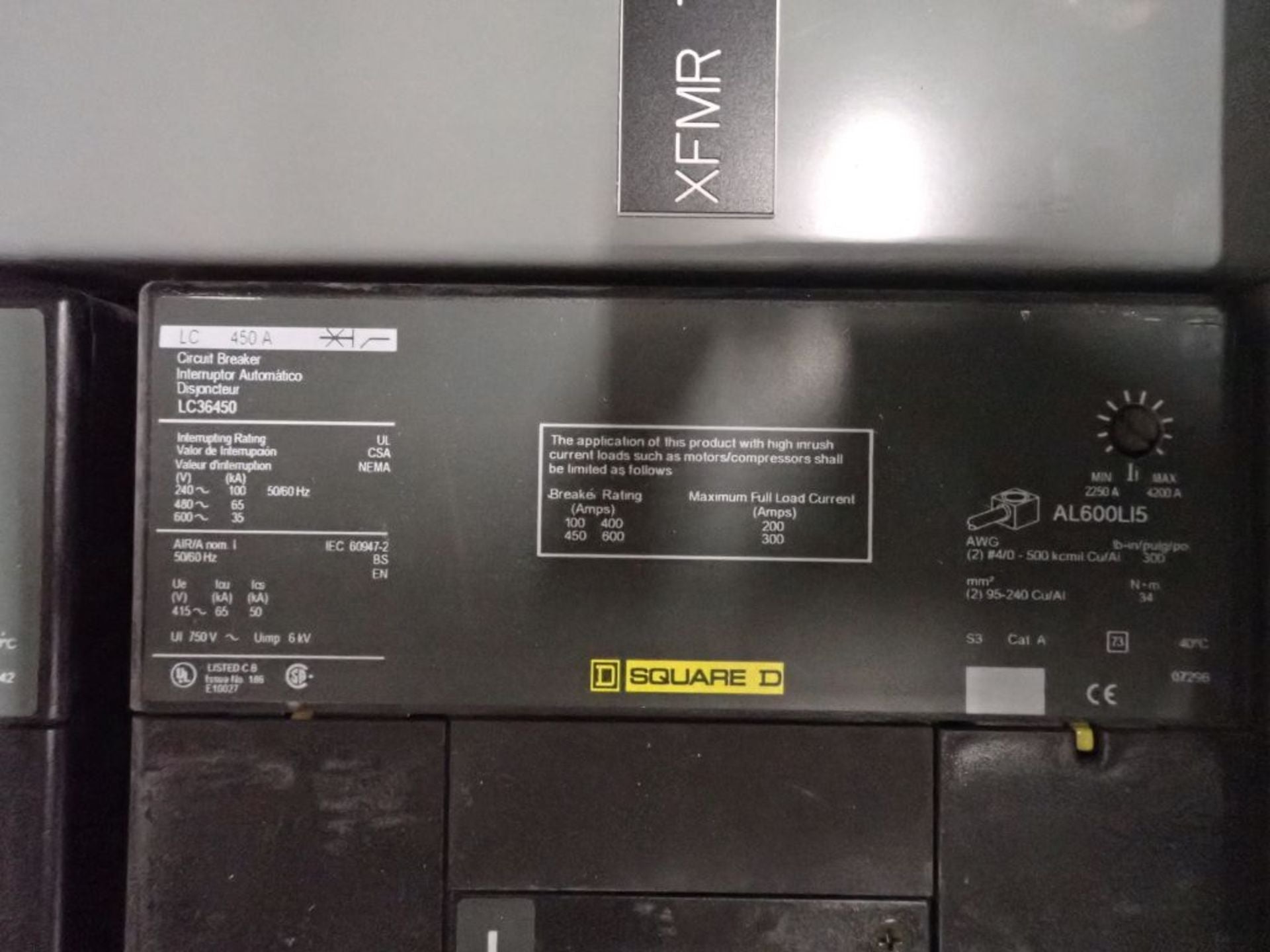 Panelboard, 800A, 480Y/277 VAC, w/(2) LC400 Circuit Breakers, (1) LC450 Circuit Breaker, (1) JJ250 Circuit Breaker