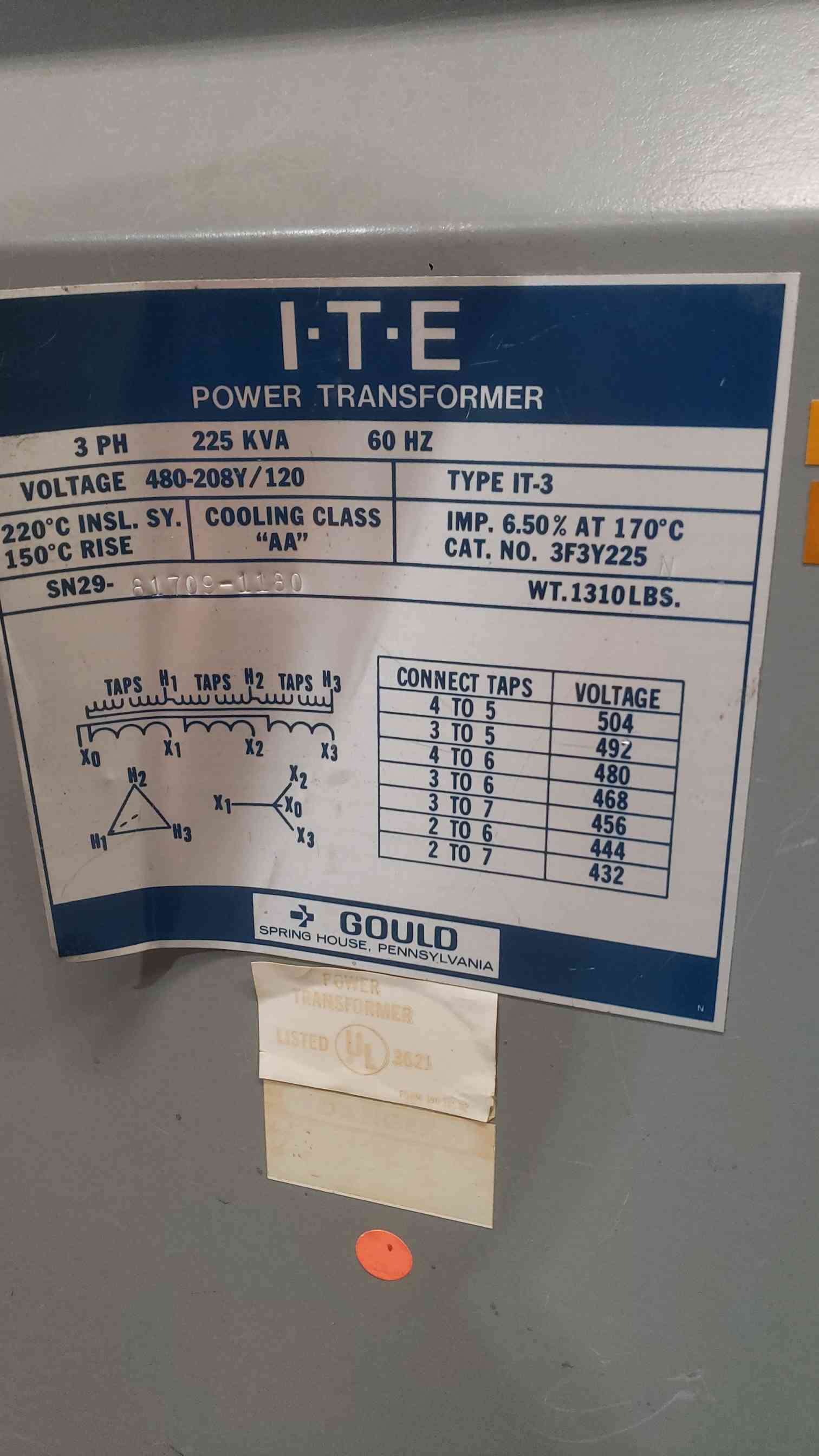 I-T-E 225KVA 480v x 208Y/120v 3PH Transformer 3F3Y225 (SKU: 112143)