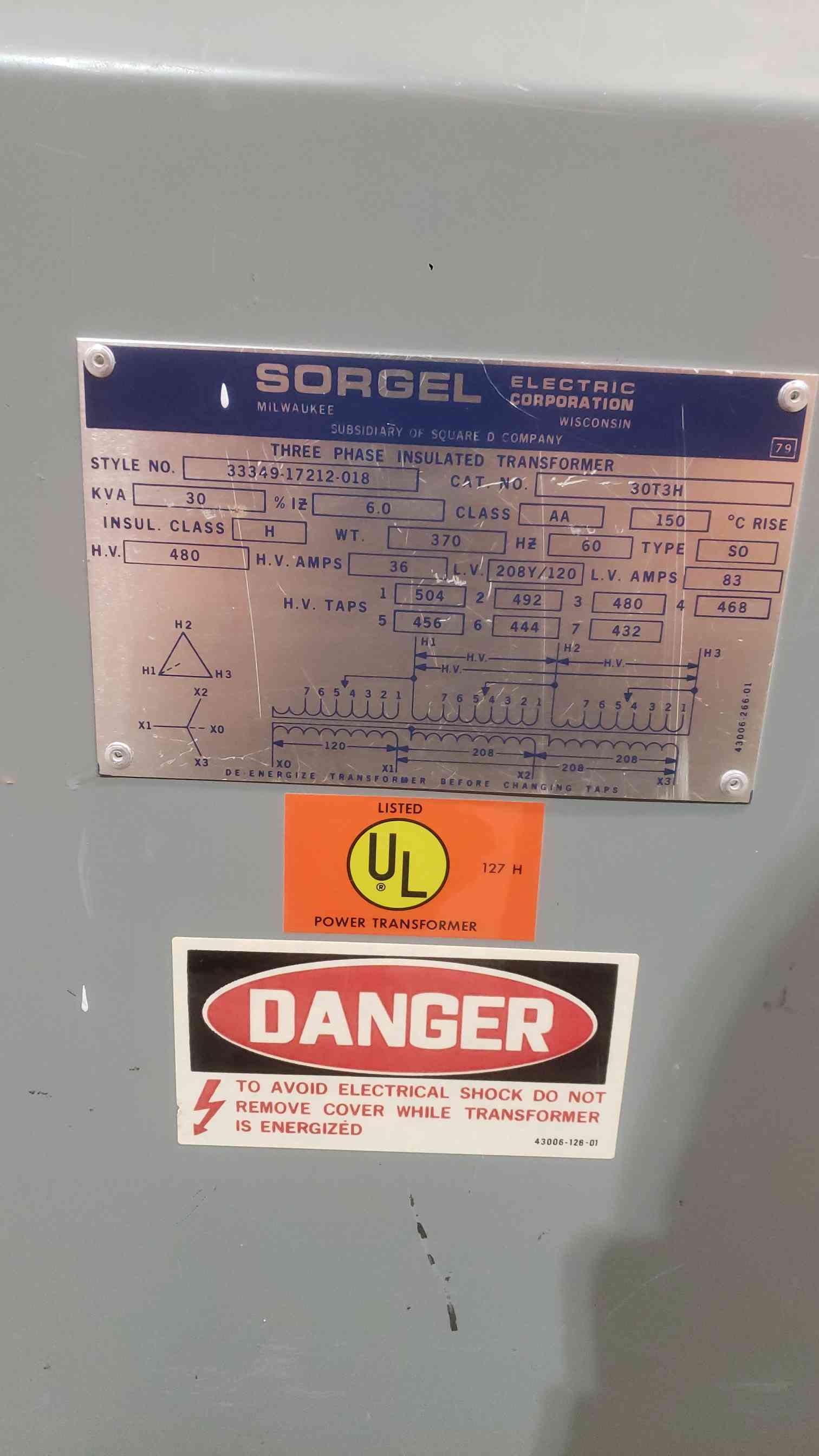 30KVA Sorgel 480-208Y/120 3PH Transformer 30T3H (SKU: 112246)