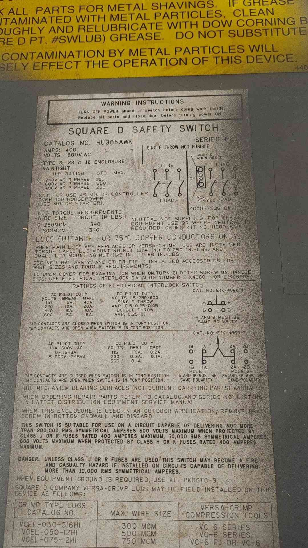 Square D 600V 400A 3PH Safety Switch HU365AWK(SKU: 112368)
