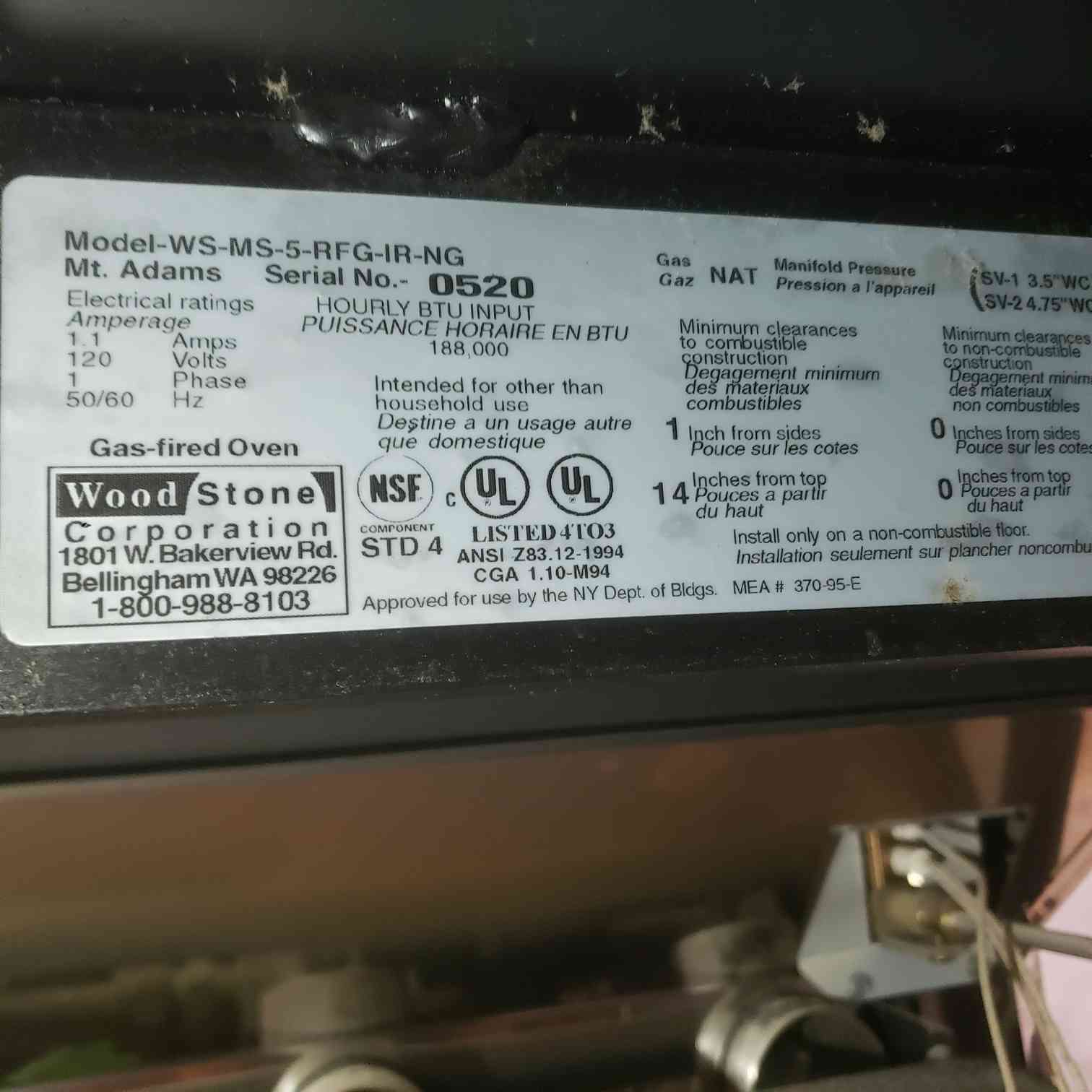 Wood Stone Nat Gas 120V 1.1A 1PH Industrial Gas Fire Pizza Oven WS-MS-5-RFG-IR-NG (SKU: 112374)