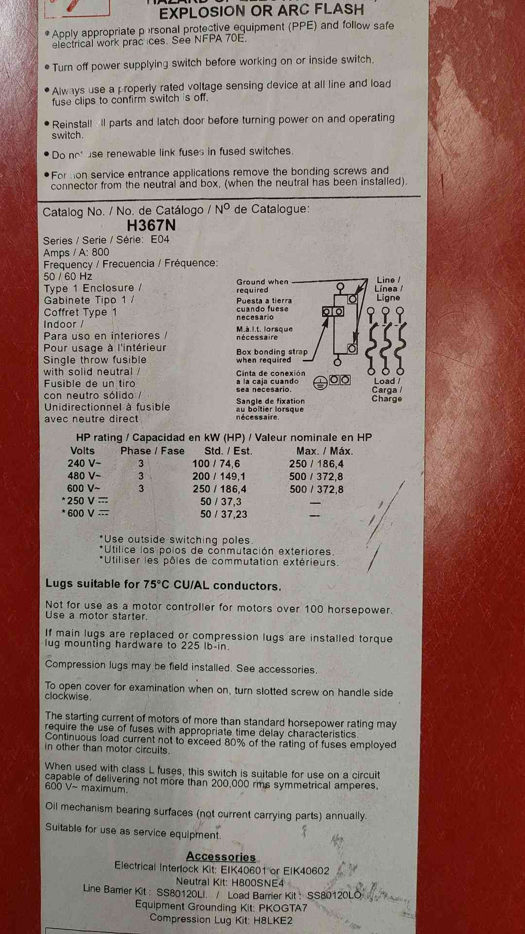 SQUARE D 800A 600V Heavy Duty Safety Switch H367N(SKU: 112377)