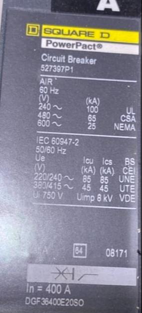 PowerPact Square D 400A Breaker 527397P1 DGF36400E20SO(S6LLST4414)