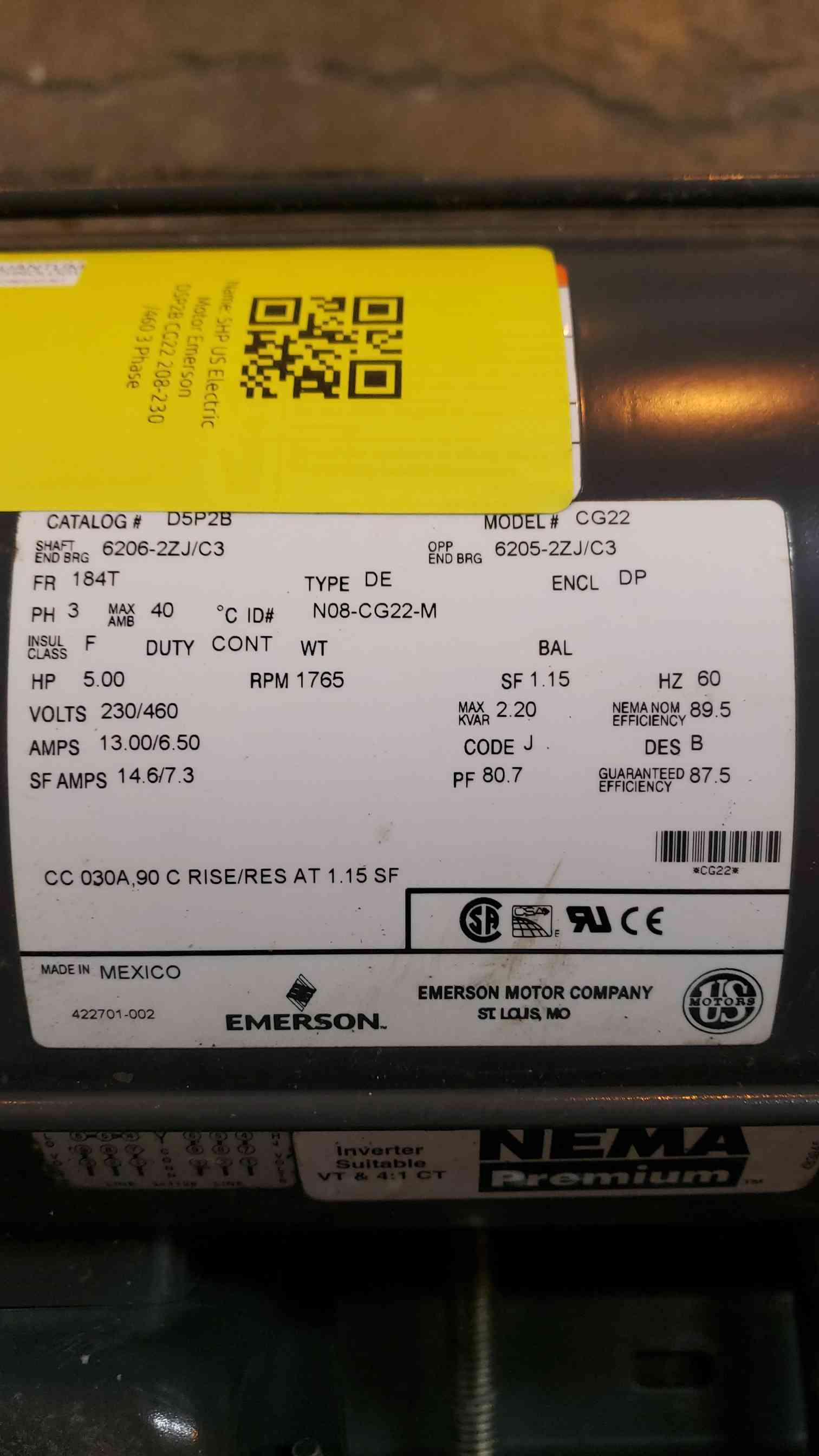 The Emerson D5P2B CG22 is the powerhouse your projects need! This 5HP electric motor is perfect for industrial applications, delivering robust performance in its class. With 208-230/460 3-phase power, it ensures optimal efficiency and energy savings.